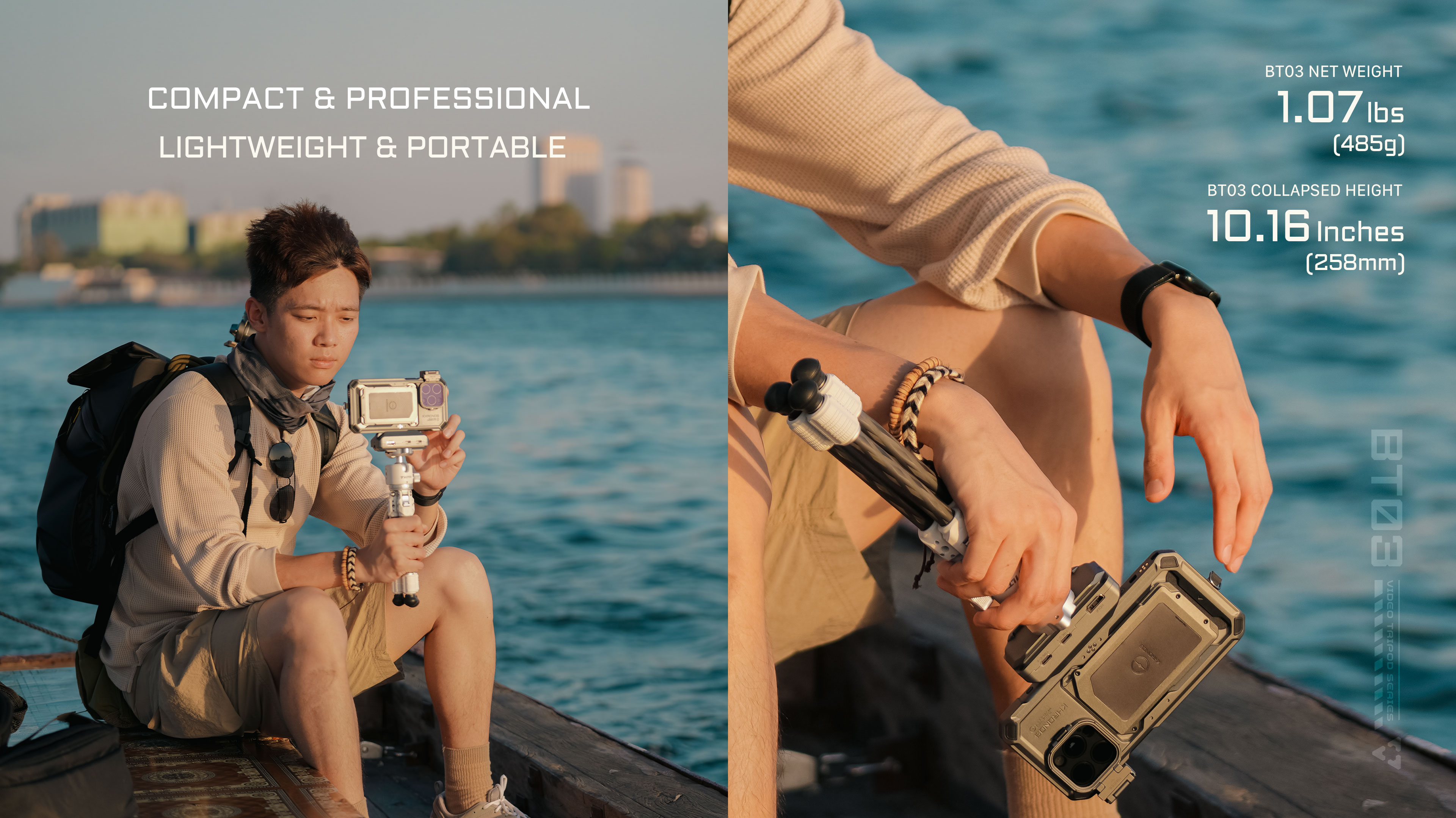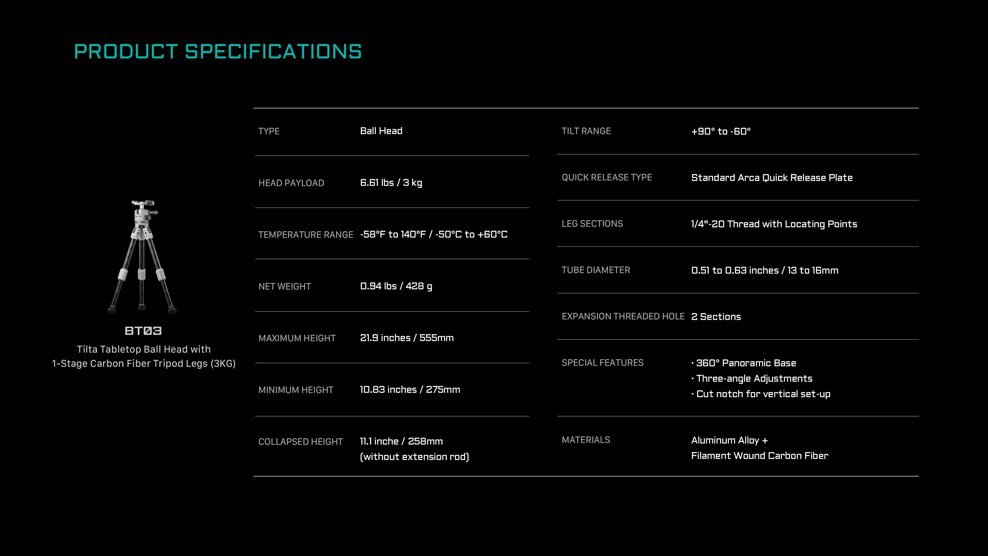 BT03 je vybavený robustnou guľovou hlavou, ktorá podporuje až 6,6 lb / 3 kg, a obsahuje slot pre 90° vertikálne fotografovanie, čo umožňuje plynulé prechody medzi horizontálnymi, vertikálnymi a nadhlavnými konfiguráciami.