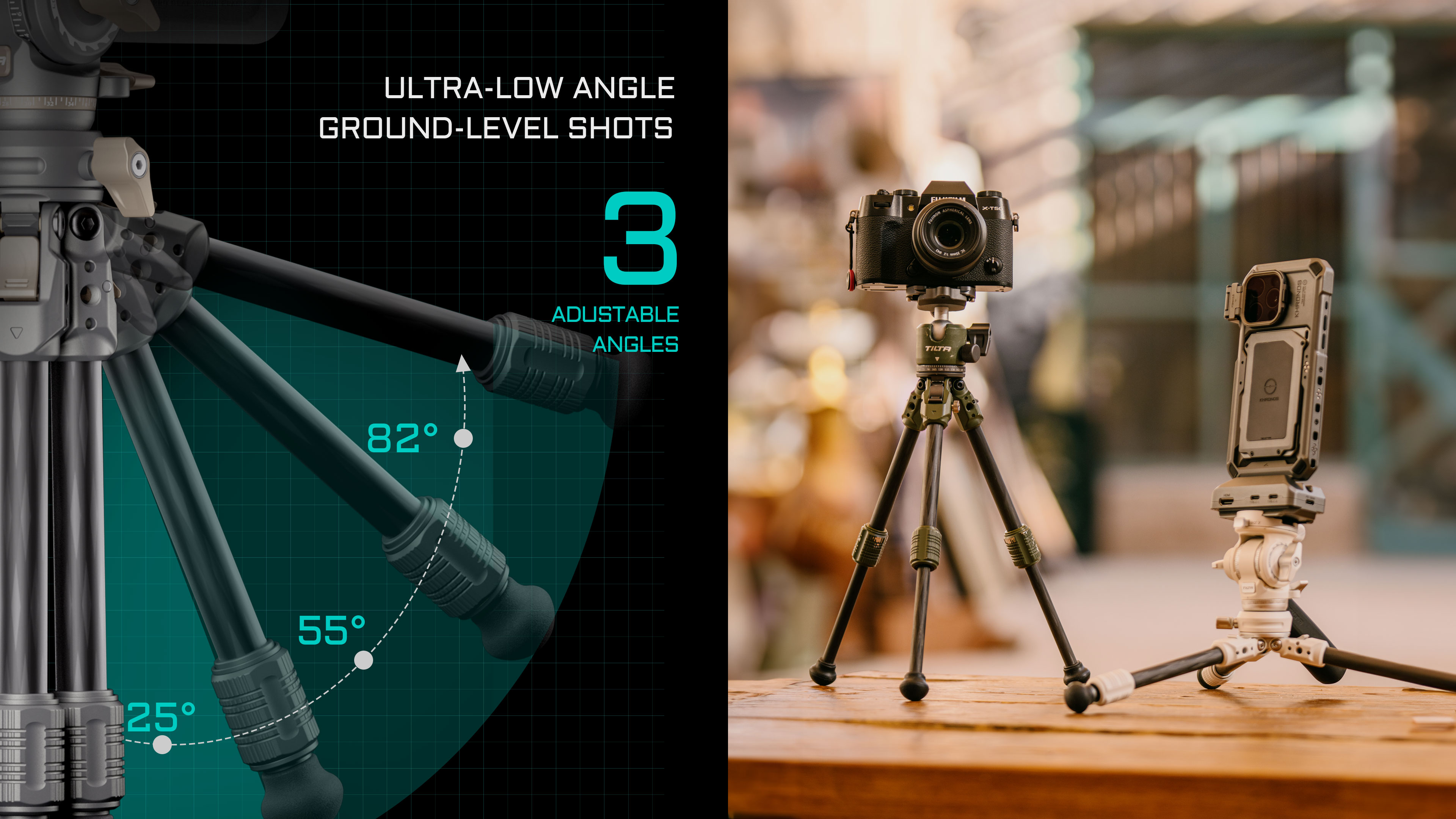 Vďaka elegantnému dizajnu bez stredového stĺpika vyniká tento statív v stiesnených priestoroch a pri snímaní z nízkeho uhla. Schopnosti statívu snímať z ultra nízkeho uhla sú vylepšené tromi nastaviteľnými uhlami nôh, čo umožňuje kreatívne perspektívy z rôznych uhlov.