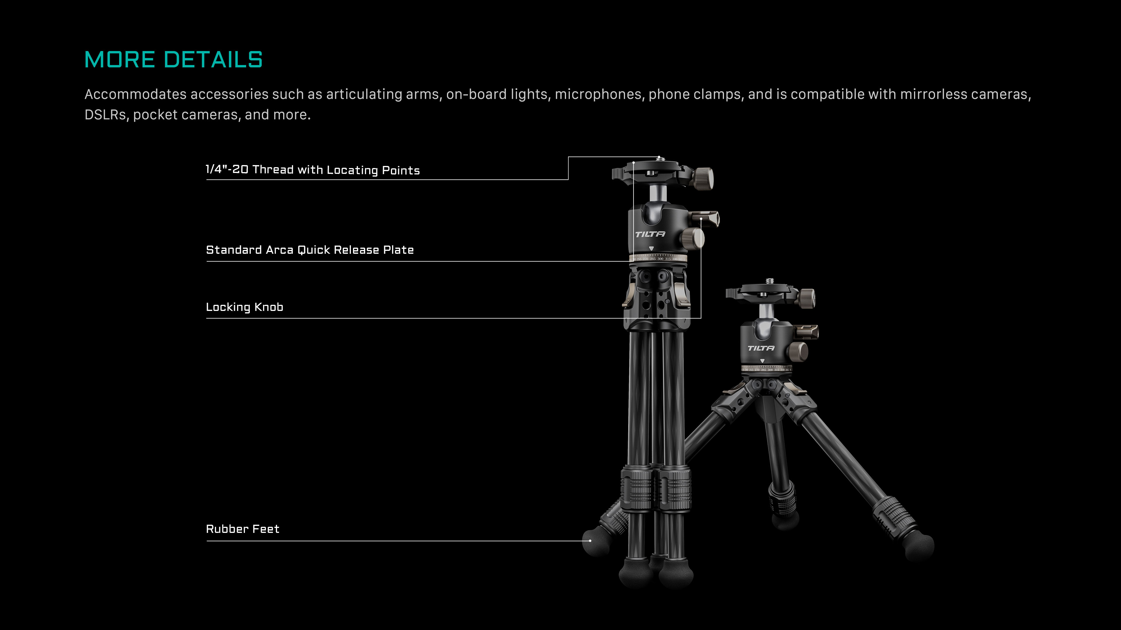 Okrem toho sa rukoväť dá vysunúť na rôzne dĺžky pre väčšie pohodlie, zatiaľ čo nohy sú vybavené 1/4″-20 upevňovacími bodmi s polohovacími kolíkmi, čo umožňuje používateľom pripevniť rôzne príslušenstvo.