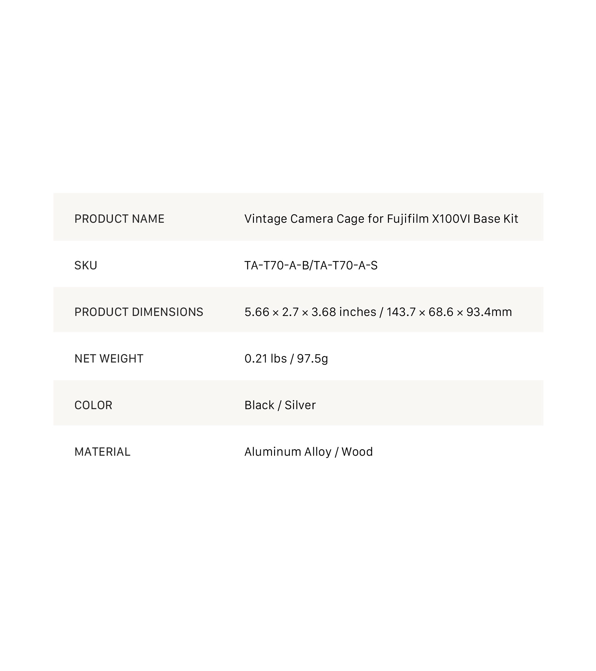 Predstavujeme klietku Vintage Camera Cage pre základnú súpravu Fujifilm X100VI. Táto súprava obsahuje niekoľko vybraných doplnkov, ktoré zlepšujú funkčnosť fotoaparátu X100VI a zároveň zachovávajú svižnosť a prenosnosť systému. Základom tejto súpravy je držiak v tvare písmena L s drevenou rukoväťou vyrobenou z orechového dreva, ktorá poskytuje pohodlnejší spôsob ovládania a manipulácie s fotoaparátom.