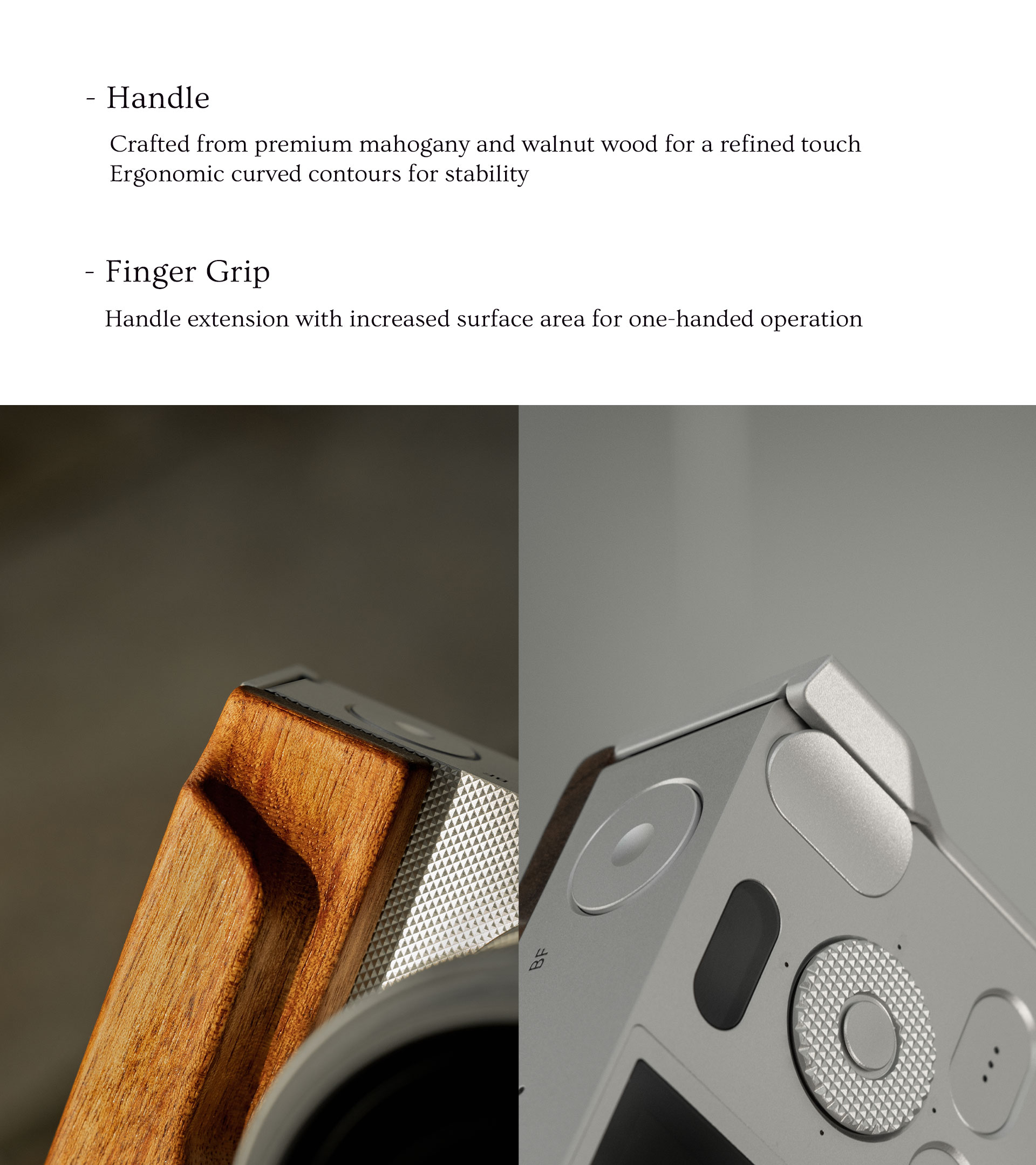 Základom tejto súpravy je príslušenstvo v tvare L-držiaka s drevenou rukoväťou, vyrobené z orechového dreva. To poskytuje pohodlnejší spôsob ovládania a manipulácie s fotoaparátom, pričom zostáva kompaktný a vhodný na cestovanie.
