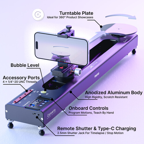 Vďaka horizontálnej nosnosti 22 libier a podpore horizontálneho aj vertikálneho nastavenia sa tento slider bez problémov hodí do štúdia aj na lokálne zábery. Converta C400, ktorá je ideálna na rozhovory, produktové zábery, vlogovanie a kreatívne filmovanie, spája výkon, inteligenciu a prenosnosť v jednom kompaktnom balení.