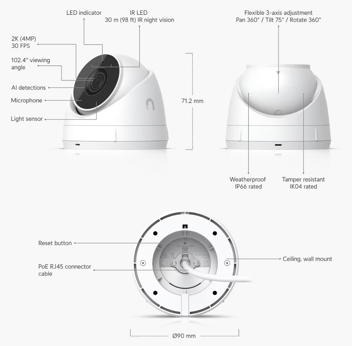 UVC-G5-Turret-Ultra je kamera piatej generácie zo série UniFi Video. Je vybavená snímačom CMOS s uhlopriečkou 1/2,4" a rozlíšením 4 MP (2688 x 1512 px, 16:9) pri 30 FPS. Pevný objektív má uhol záberu 102,4° horizontálne, 54,9° vertikálne a 120,6° diagonálne. Kamera je vybavená mikrofónom (možno vypnúť) a (1) 10/100 Mbps ethernetovým portom, cez ktorý je kamera napájaná pomocou POE 802.3af alebo pasívneho POE s vstupným napätím 37 – 57 V DC. Pre nočný režim je kamera vybavená IR osvetlením s dosahom 30 m. Maximálna spotreba energie je len 4 W!