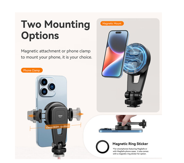 Tento ľahký, ale odolný magnetický držiak na smartfón 2 v 1 ponúka prenosnosť, flexibilitu a rýchle nastavenie pre každodenné vytváranie obsahu.