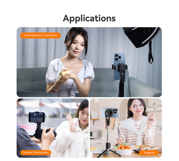 Magnetická doska kompatibilná s MagSafe podporuje vertikálnu aj horizontálnu orientáciu s otočením o 360° pre plynulé prepínanie medzi režimami na výšku a na šírku. Rozsah naklonenia 180° (-90° až 90°) umožňuje presné nastavenie uhla, vďaka čomu je ľahké komponovať zábery presne tak, ako chcete.