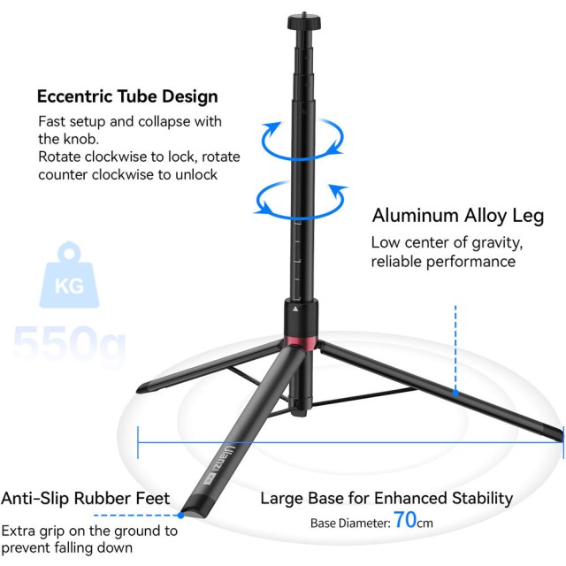 Stativ Ulanzi AT-01 Offset Vlog je kompaktný a odolný hliníkový stativ určený pre vlogerov a tvorcov obsahu. Rýchlo sa otvára, je ľahký a unesie až 5 kg. Rozťahuje sa od 48 cm do 152 cm a poskytuje stabilitu pre fotoaparáty a príslušenstvo na cestách.