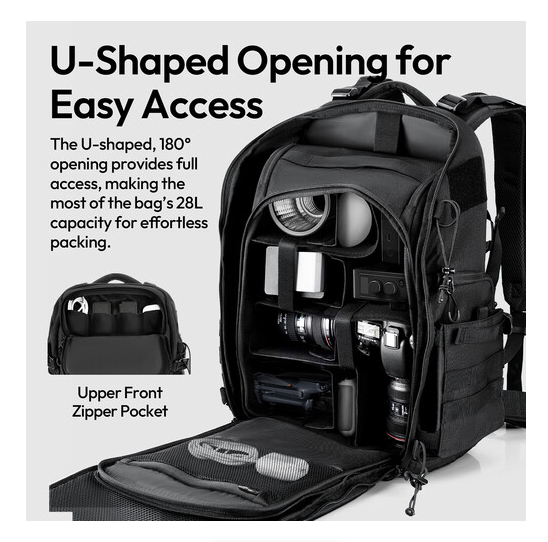 Tento taktický batoh ponúka dostatok úložného priestoru, vrátane hornej vrecka s rýchlym prístupom a vreciek na 15,7-palcový notebook a 11-palcový tablet. Hlavný priestor sa otvára pomocou konštrukcie typu clamshell, ktorá umožňuje ľahký prístup k vrecku na fotoaparát, zatiaľ čo bočný panel s rýchlym prístupom vám umožňuje vybrať fotoaparát aj počas pohybu. Predné a bočné popruhy MOLLE umožňujú pripevniť ďalšie vybavenie a do bočného vrecka môžete uložiť fľašu s vodou alebo cestovný statív. Batoh obsahuje aj vonkajšie popruhy na upevnenie objemných predmetov, ako sú bundy alebo spacie vaky. Či už sa chystáte na fotenie alebo na dobrodružstvo, tento 28-litrový batoh je navrhnutý tak, aby poskytoval pohodlie, prehľadnosť a ochranu vášho vybavenia.