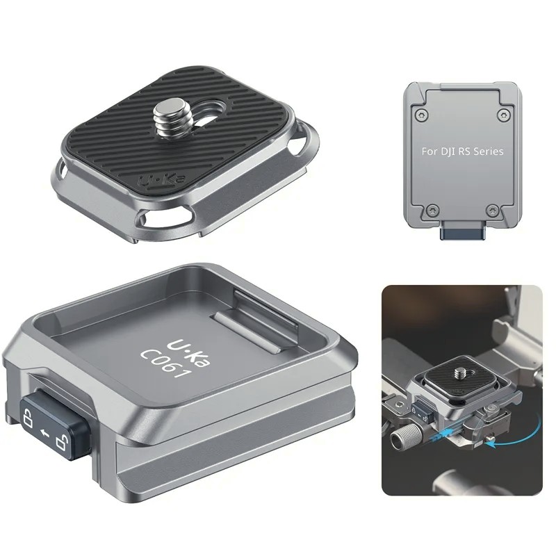 Súprava Ulanzi C061 Uka Quick Release Kit pre sériu DJI RS je navrhnutá tak, aby zefektívnila montáž kamery pre filmárov a tvorcov obsahu používajúcich stabilizátory DJI RS. Tento univerzálny systém rýchleho uvoľnenia, navrhnutý pre kompatibilitu s DJI RS 2, RS 3, RS 3 Pro, RS 4, RS 4 Pro a RS 4 Mini, vám umožňuje namontovať a demontovať kameru za niekoľko sekúnd pri zachovaní maximálnej stability.