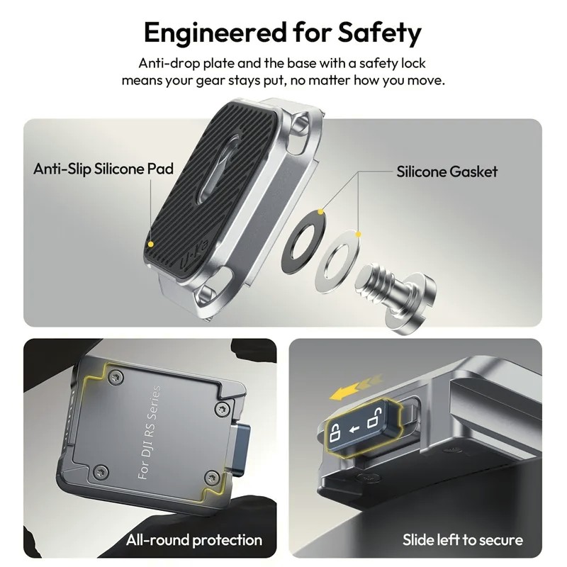 Vďaka konštrukcii s posuvnou inštaláciou sa doska kamery bezpečne zaistí v základni pomocou vstavaného bezpečnostného zámku a mechanizmu proti pádu, čím sa zabezpečí, že kamera zostane pevne pripevnená aj počas dynamického pohybu. Sada C061 je plne kompatibilná s rýchloupínacími doskami Uka a F38, čo umožňuje jednoduchý prechod medzi gimbalmi, statívmi, ramennými držiakmi a inými podpornými systémami.