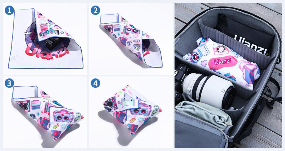 Utierka na fotoaparát využíva špeciálnu štruktúru vlákien, ktorá pri skladaní prilieha k povrchu a zadnej strane utierky. Stredná hrúbka poskytuje dodatočnú ochranu pred nárazmi a trením. Podšívka je vyrobená z kefovaného materiálu, ktorý je príjemný na dotyk a umožňuje jednoduché ukladanie predmetov.