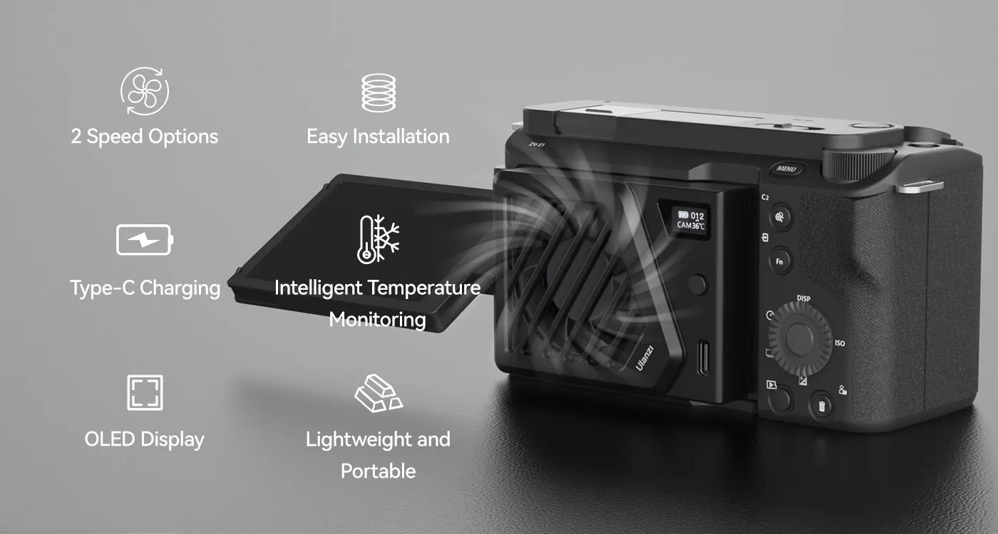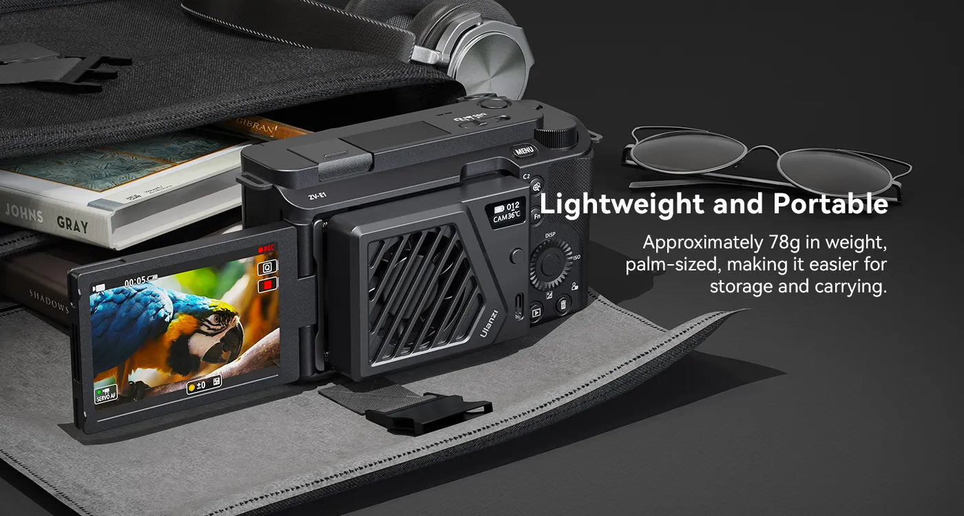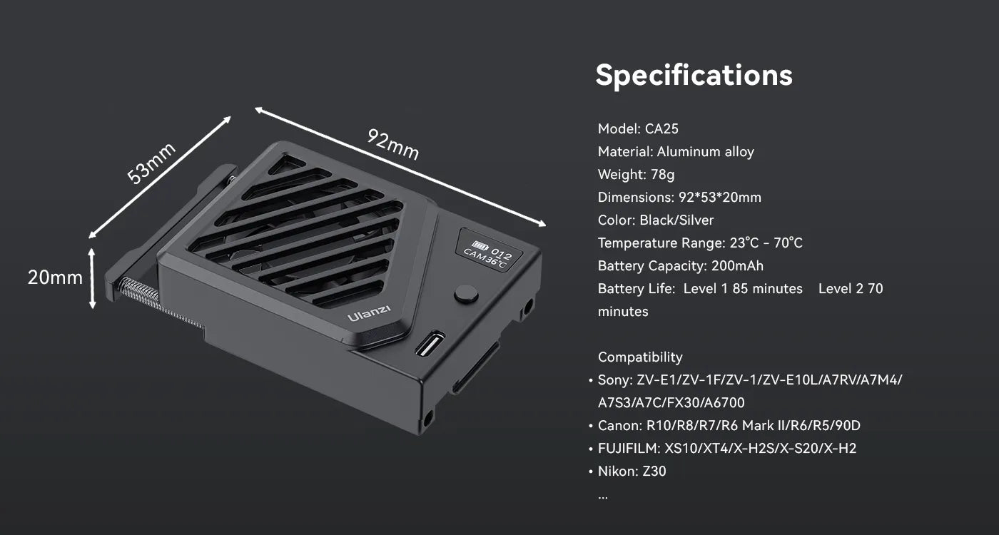 Chladiaci ventilátor fotoaparátu Ulanzi CA25 je skvelá investícia, najmä počas letných mesiacov, keď sa fotoaparáty pri dlhšom používaní ľahko prehrievajú. Je navrhnutý pre fotoaparáty Sony, Canon a FUJIFILM a účinne zabraňuje prehrievaniu, čím zabezpečuje, že váš fotoaparát bude fungovať optimálne aj v horúcich podmienkach. Je to nevyhnutné príslušenstvo na udržanie optimálneho výkonu a zabránenie potenciálnym problémom spôsobeným nadmerným prehrievaním počas fotografovania. Kompatibilný s fotoaparátmi ako Sony ZV-E1/ZV-1F/ZV-1/ZV-E10L/a7RV/a7 IV (A7M4)/a7S III (A7S3)/A7C/FX30/A6700, Canon R10/R8/R7/R6 Mark II/R5/90D, FUJIFILM XS10/XT4/X-H2S/X-S20/X-H2, Nikon Z30 a ďalšie.