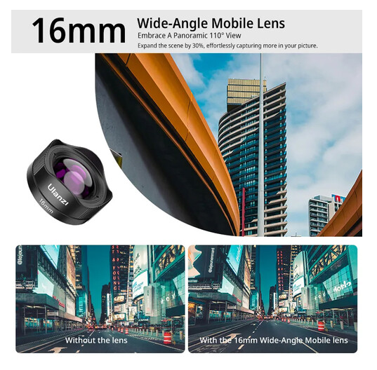 Ultraširokouhlý objektív Ulanzi F008 CL-005 Mobile Phone Generation 3 je prémiový nasadzovací objektív určený pre telefóny iPhone, Android a Samsung. S ohniskovou vzdialenosťou 16 mm a uhlom záberu 110° poskytuje tento objektív širokouhlé zábery s minimálnym skreslením. Je vybavený vysoko kvalitným optickým sklom, hliníkovou konštrukciou a minimálnou zaostrovacou vzdialenosťou 1,2". Súčasťou balenia je aj klip na objektív s držiakom na príslušenstvo.