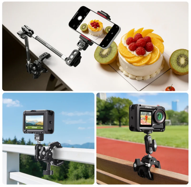 Jeho robustná super svorka má konštrukciu s 3 čeľusťami, ktorá zaisťuje pevné uchytenie na plochých aj guľatých povrchoch, zatiaľ čo priložené magické rameno s dvojitou guľovou hlavou umožňuje polohovanie v plnom rozsahu 360°. Vďaka tomu je ľahké dosiahnuť kreatívne uhly, ako sú zábery zhora, osvetlenie z nízkeho uhla alebo bočné monitorovacie zostavy.