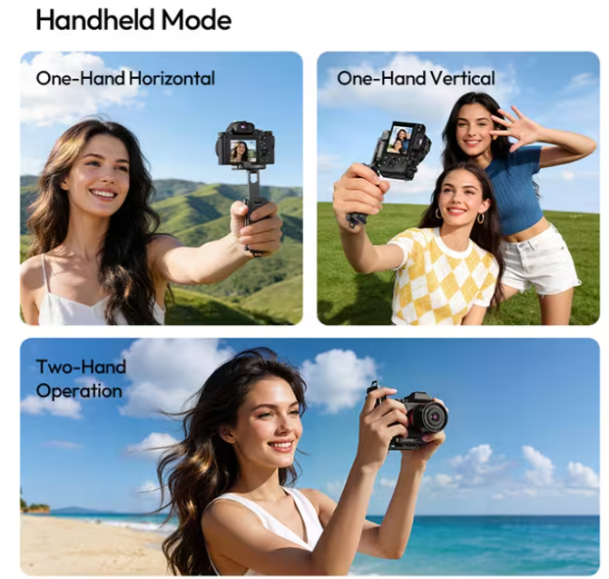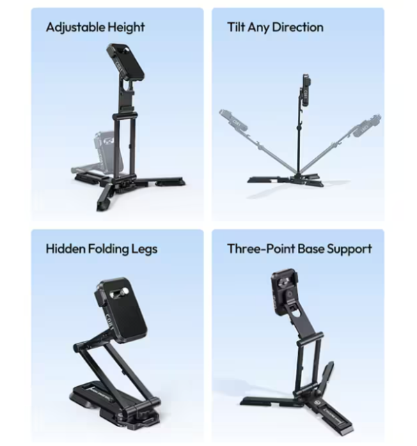 Stojan podporuje plnú 360° rotáciu s plynulým tlmením, čo umožňuje presné komponovanie záberu a rýchle zmeny uhla. Okrem toho jeho viacosiový systém nastavenia (rozsah otáčania 210°, 350°, 210°, 360°, 120°) poskytuje používateľom úplnú kontrolu nad polohovaním, vďaka čomu je ideálny pre dynamické prostredia natáčania, stolové zostavy a kreatívne kompozície.