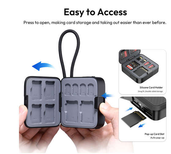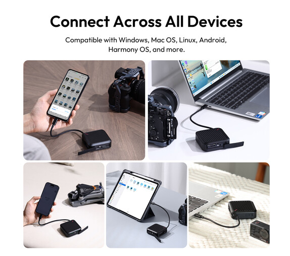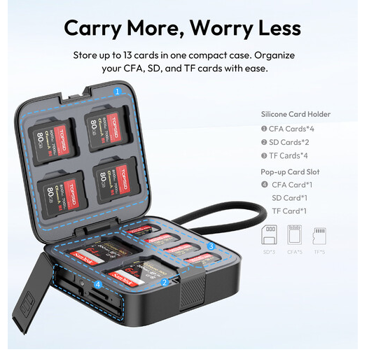 Puzdro na čítačku kariet Ulanzi CRC10 3 v 1 je výkonné a prenosné riešenie pre tvorcov, ktorí potrebujú rýchly prenos a organizované ukladanie médií. Je navrhnuté tak, aby fungovalo ako čítačka kariet aj ako puzdro na ukladanie, a podporuje karty CFexpress typu A, SD a microSD súčasne prostredníctvom troch vyhradených slotov na čítačku. Okrem toho ponúka dostatočný vnútorný úložný priestor so štyrmi slotmi CFexpress Type A, dvoma slotmi SD a štyrmi slotmi microSD, čo vám umožňuje uložiť až 13 kariet v jednej kompaktnej jednotke. Integrovaný kábel USB-C 3.2 Gen 2 poskytuje rýchlosť prenosu dát až 10 Gb/s, čo umožňuje rýchle zálohovanie a efektívne pracovné postupy bez potreby adaptérov. Vonkajší plášť z hliníkovej zliatiny zvyšuje odolnosť a odvod tepla, zatiaľ čo vnútorná silikónová výstelka chráni karty pred nárazmi. Vďaka prístupu stlačením, LED indikácii stavu, širokej kompatibilite s operačnými systémami a integrovanému remienku na jednoduché prenášanie je CRC10 ideálnym spoločníkom pre fotografov, kameramanov a mobilných profesionálov.