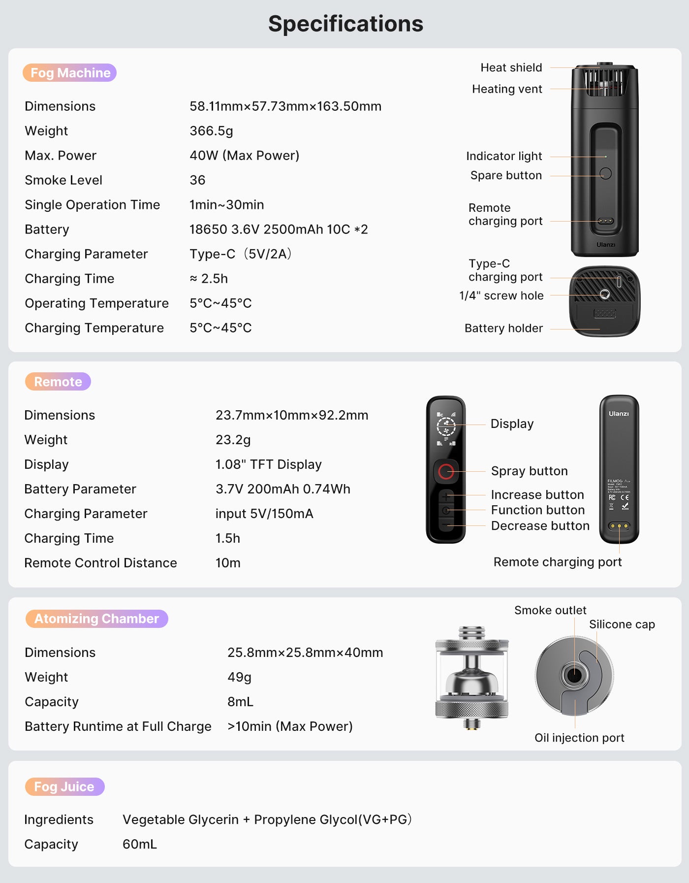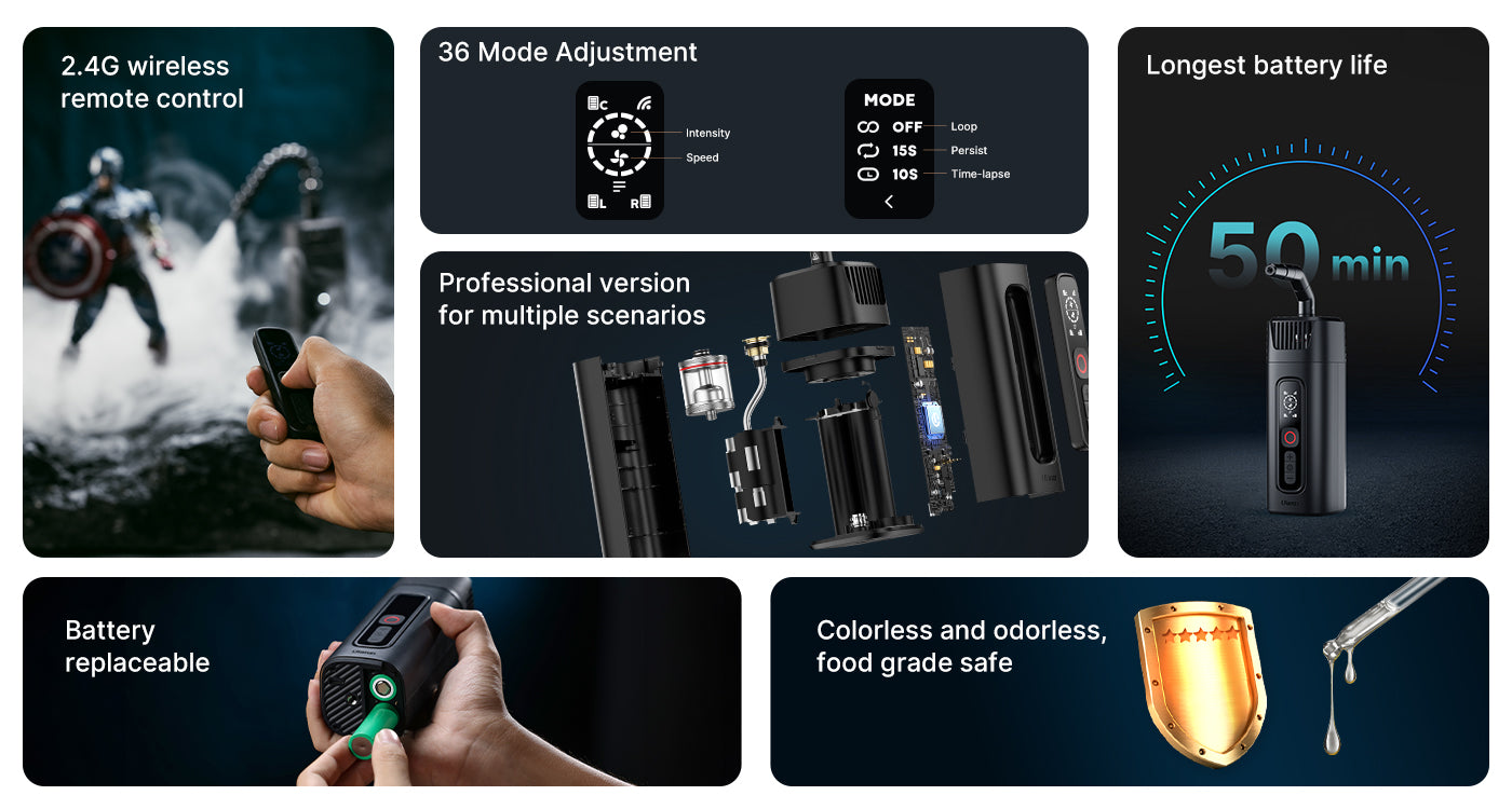 Ulanzi FM01 FILMOG Ace prenosný stroj na výrobu hmly, stroj na výrobu dymu s 36 efektmi hmly v rôznych intenzitách, 40 W hmla s diaľkovým ovládaním (až 10 metrov), prenosný ručný stroj na výrobu hmly, ideálny na fotografovanie, vonkajšie podujatia, párty, javiskové efekty, Halloween alebo svadby.