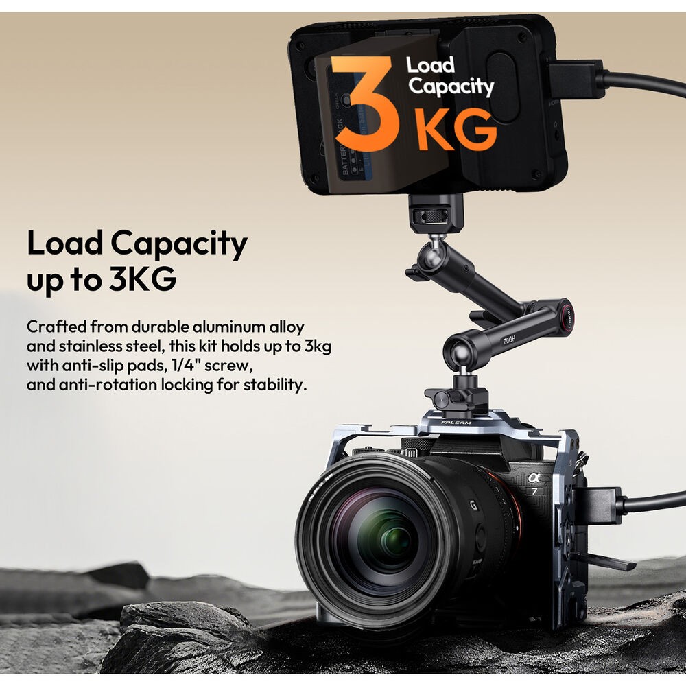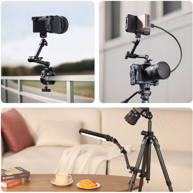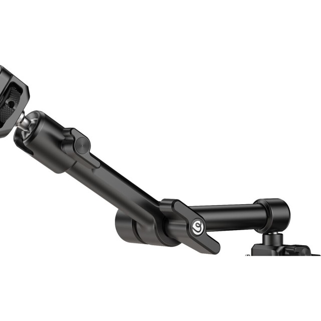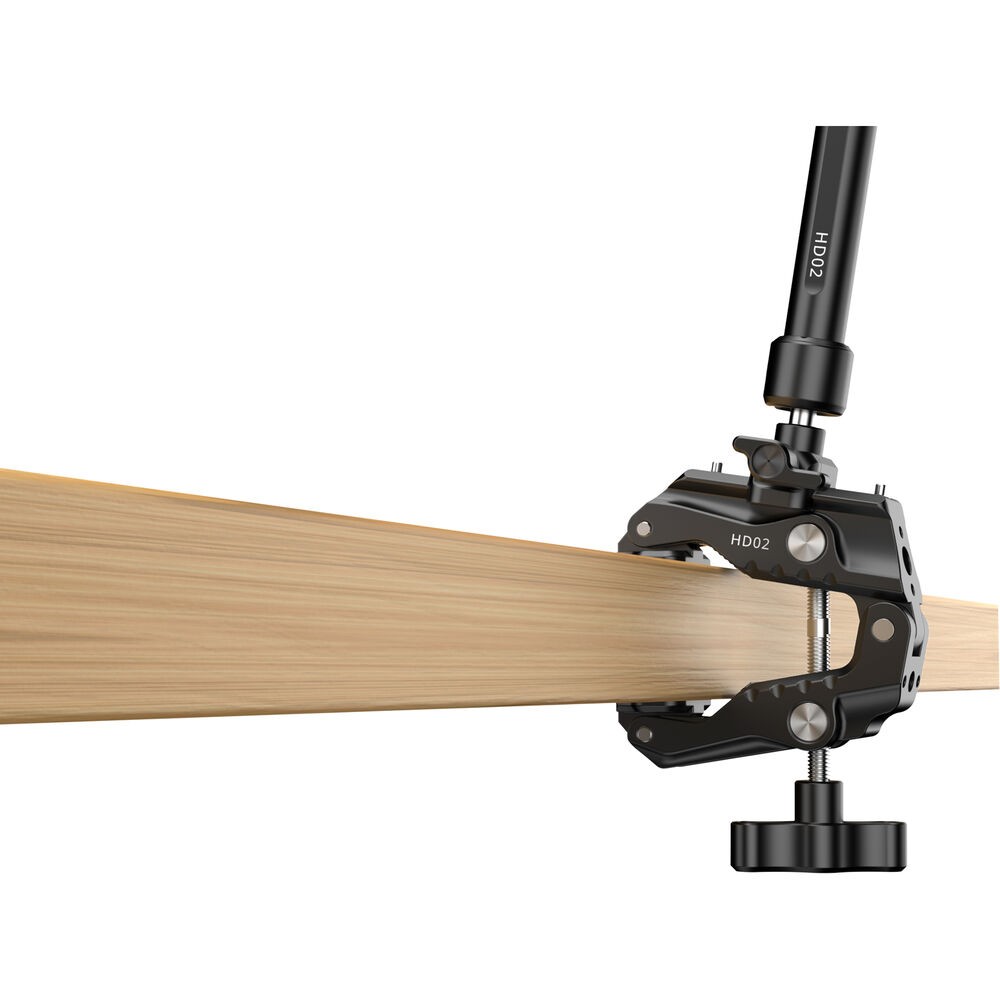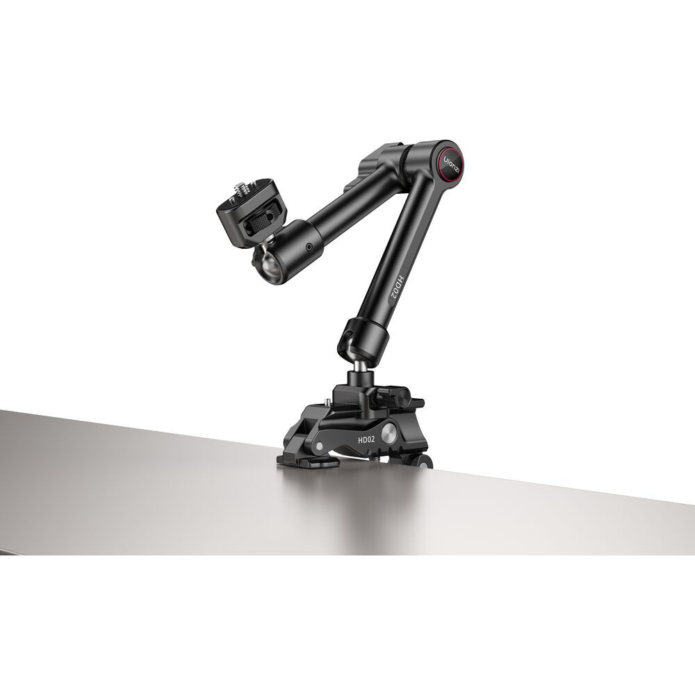 HD02 Magic Arm s Crab ClampodUlanzi je 10" magické rameno s nosnosťou 6,6 lb. Upevňujte kamery, svetlá alebo iné príslušenstvo pomocou skrutky 1/4"-20 s lokalizačnými kolíkmi ARRI alebo otvormi so závitom 1/4"-20 a 3/8"-16. Rameno pripevnite k povrchom s hrúbkou od 0,86 do 3,4" pomocou priloženej svorky s protišmykovými podložkami. Po namontovaní je možné jednoducho nastaviť uhol vďaka 360° guľovej hlave na každom konci a 360° otáčaniu medzi dvoma časťami ramena.