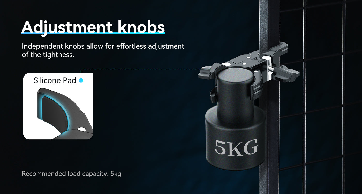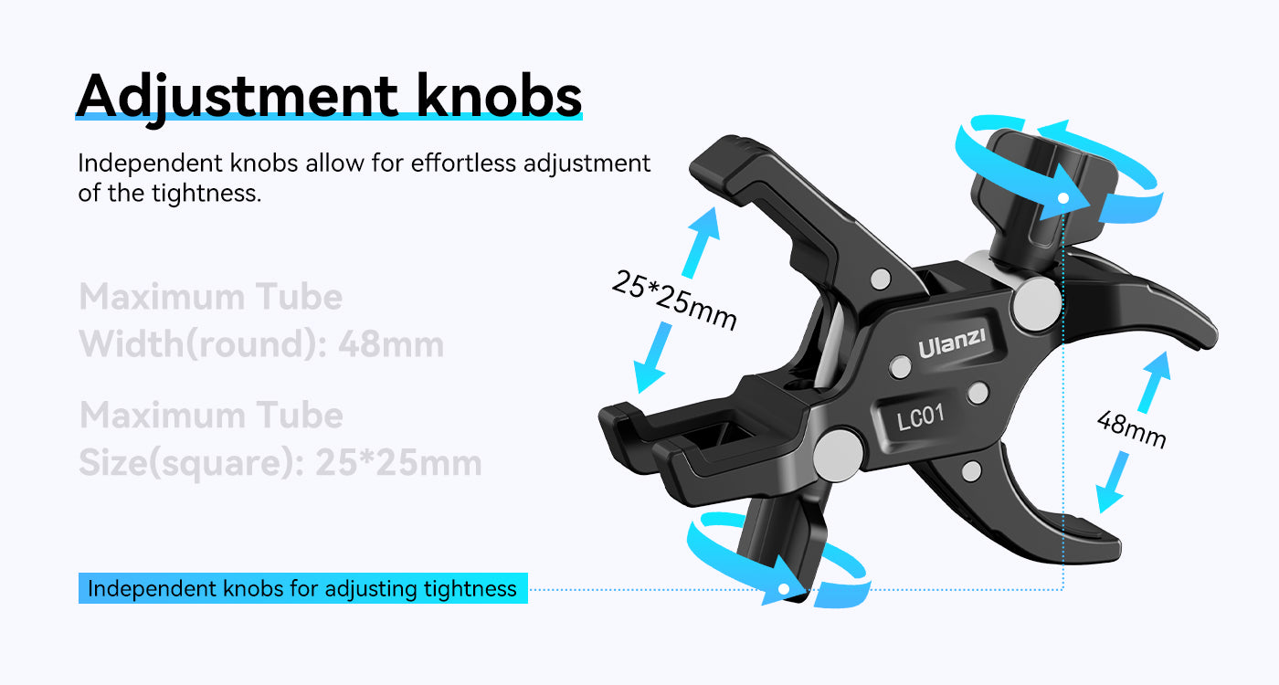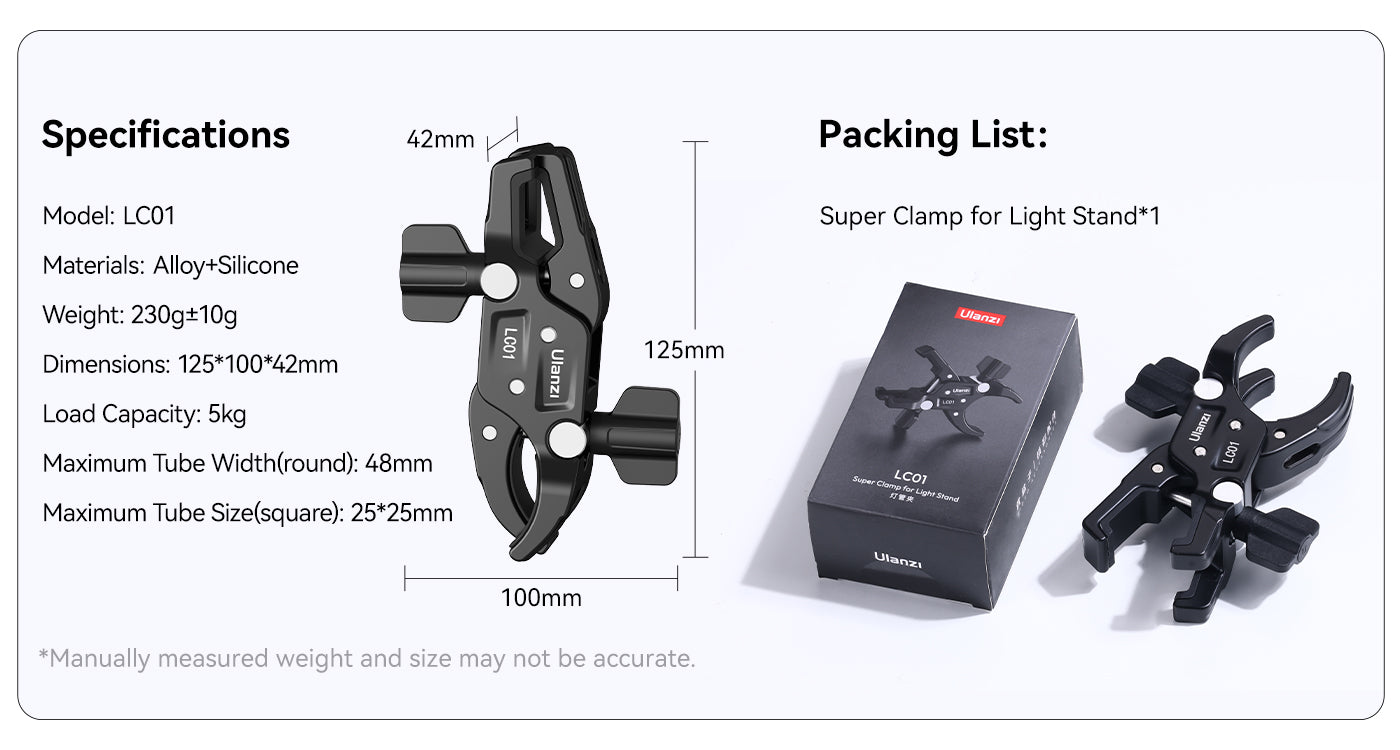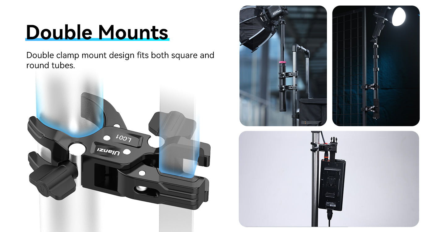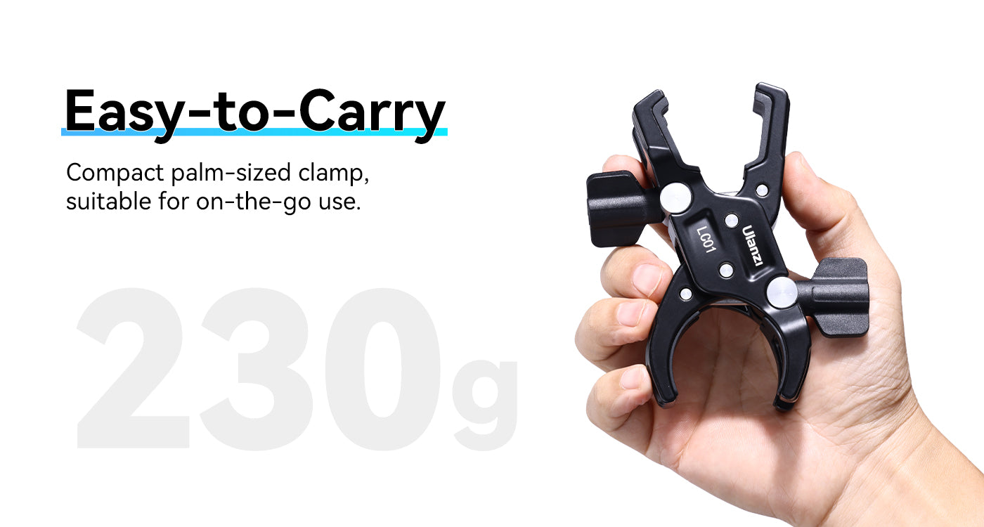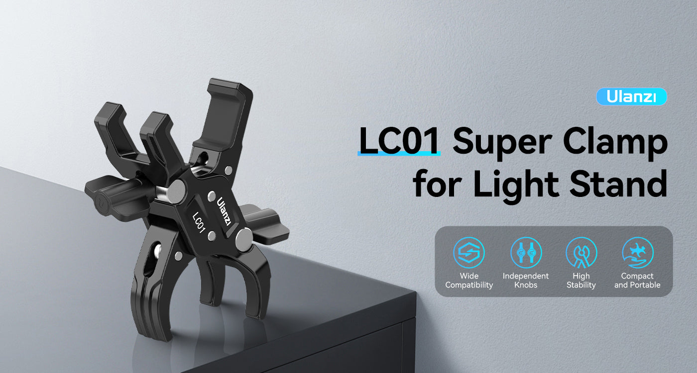 Ulanzi LC01 Super Clamp Mount je kompaktné, odolné riešenie na upevnenie zariadenia na svetelné stojany, statívy alebo montážne konštrukcie. Vďaka dvojitým svorkám, ktoré sa hodia na okrúhle aj hranaté rúrky, unesie až 5 kg zariadenia – ideálne pre svetlá, kamery alebo príslušenstvo. Je vyrobený z odolnej zliatiny a silikónu s vysokou priľnavosťou, čo zaručuje pevnú stabilitu. LC01 je ideálny pre mobilných tvorcov aj profesionálov v štúdiách a ponúka presné ovládanie a prenosnosť v jednom výkonnom zariadení veľkosti dlane.