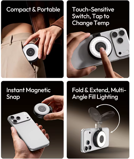 Magnetické doplnkové osvetlenie Ulanzi LM21 je univerzálny osvetľovací doplnok určený pre tvorcov, ktorí potrebujú spoľahlivé osvetlenie v kompaktnom a cestovateľsky praktickom vyhotovení. Vďaka kompatibilite s MagSafe sa ľahko pripája k podporovaným modelom iPhone alebo magnetickým puzdrám na telefóny a poskytuje okamžité osvetlenie pre selfie, nahrávanie videa, živé vysielanie a videohovory.