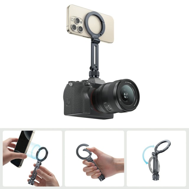 Ulanzi MA07 MagLock 1/4 Cold Shoe Bracket je univerzálny, skladací stojan na telefón a držiak príslušenstva s jednorukým MagSafe snap-on, plynulým otáčaním a naklápáním a univerzálnou kompatibilitou s 1/4"-20 a cold shoe. Kompaktný, ľahký a pripravený na cestovanie, je ideálny pre živé vysielanie, rozhovory, snímanie na dvoch obrazovkách a kreatívne mobilné nastavenia.