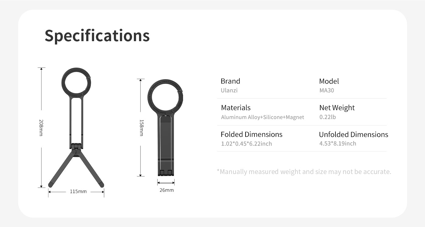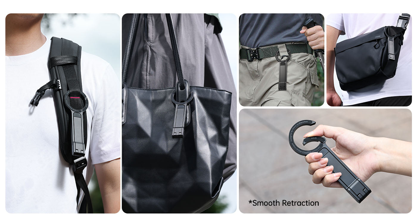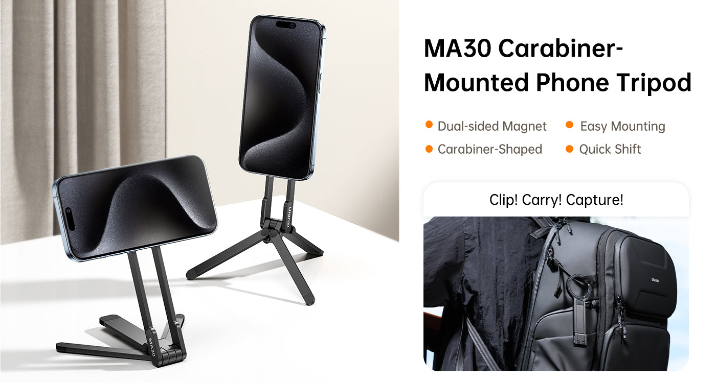 Stativ na telefón Ulanzi MA30 s karabínovým uchytením – kompatibilný s MagSafe, ultraprenosný a vhodný pre tvorcov. Zaves, zlož, foť. Ulanzi MA30 je statív pre telefón v tvare karabíny určený pre tvorcov, ktorí potrebujú rýchle nastavenie, flexibilné uhly a kompaktnú prenosnosť. Nech už vlogujete na cestách alebo natáčate v stiesnených priestoroch, tento držiak kompatibilný s MagSafe je pripravený na pripnutie a snímanie.