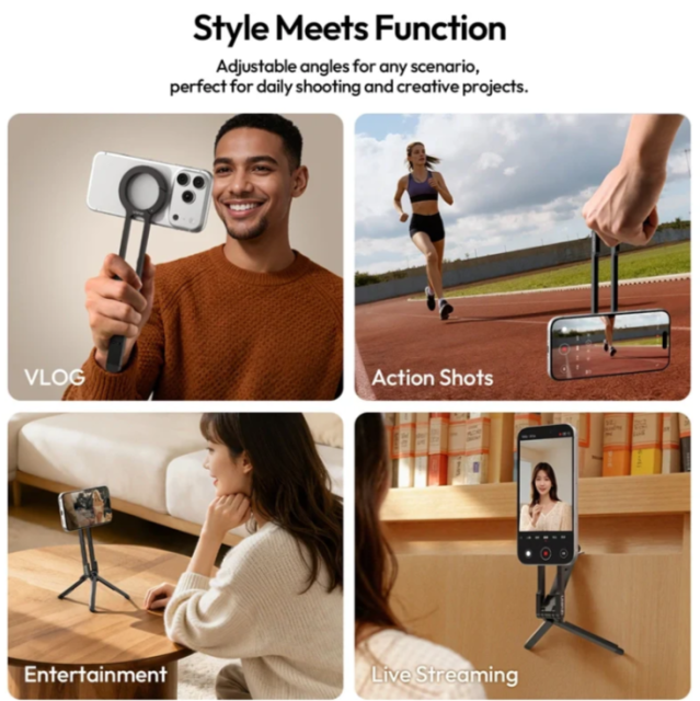 Trojnožka na telefón Ulanzi MA57 MagSafe s karabínou S007 je určená pre tvorcov, ktorí chcú plynule prechádzať medzi režimami držania v ruke, použitia na statíve, stojane a v režime „mantis“. Jej nastaviteľné uhly zaručujú dokonalé kompozície pre vlogy, akčné zábery, zábavné videá a živé vysielanie. Patentovaná karabína s rýchloupínaním sa bezpečne pripne k taškám, vďaka čomu máte trojnožku počas cestovania vždy po ruke, zatiaľ čo skrytý háčik v režime „mantis“ umožňuje stabilné zábery z vysokého uhla nad hlavou na pevných povrchoch. Vďaka obojstrannému systému MagSafe predná časť bezpečne drží zariadenia iPhone 12–17 a zadná časť podporuje magnetické príslušenstvo pre vylepšené kreatívne nastavenia. Je ľahký a kompaktný, váži len 68 g a ľahko sa zmestí do vrecka. Trojnohá základňa s protišmykovými silikónovými podložkami zaisťuje pevnú stabilitu pre snímanie bez chvenia.