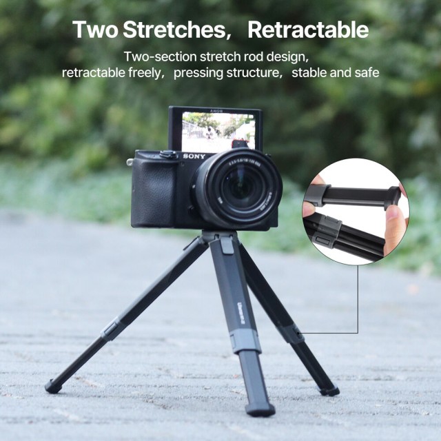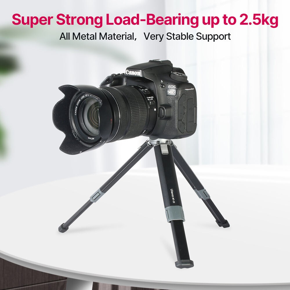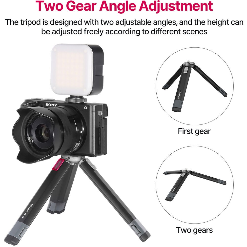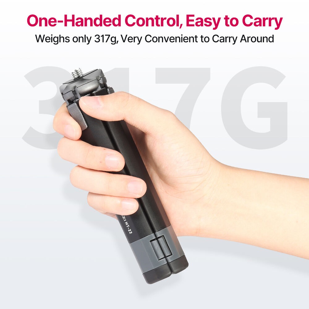 Ulanzi MT-22 je kompaktný, celokovový mini statív s uchytením 1/4"-20, ktorý unesie až 2,5 kg (5,5 lb). Jeho dvojdielne nohy s push-pull mechanizmom umožňujú rýchle nastavenie, nastaviteľné uhly a zábery s nízkou perspektívou, vďaka čomu je ideálny pre akčné kamery, kompaktné bezzrkadlové fotoaparáty alebo webové kamery.