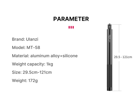 Vysúvateľná selfie tyč Ulanzi MT-58 je ľahká a odolná tyč určená pre akčné kamery. Vďaka nastaviteľnej dĺžke od 29,5 cm do 120 cm, štíhlemu „neviditeľnému“ dizajnu umožňujúcemu 360° zábery a bezpečnému uchyteniu 1/4"-20 je ideálna na zaznamenávanie pútavých záberov počas cestovania, športových aktivít a outdoorových dobrodružstiev.