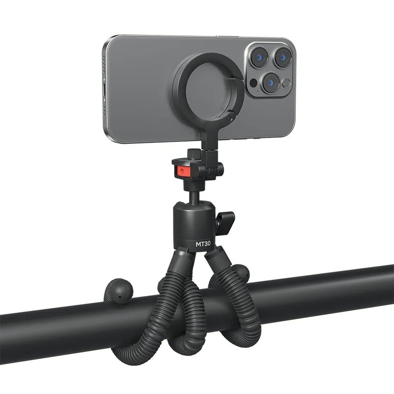 Magnetický flexibilný statív Ulanzi MT30 je ľahký statív vhodný na cestovanie pre tvorcov obsahu, ktorí sú často na cestách. Jeho jedinečný dizajn s karabínou umožňuje jednoduché pripevnenie k taškám, opaskom alebo inému vybaveniu, vďaka čomu ho môžete prenášať bez použitia rúk. MT30 disponuje silnou magnetickou silou na prednej strane (>14 N), ktorá je kompatibilná s telefónmi MagSafe alebo magnetickými nálepkami, čo umožňuje bezpečné upevnenie bez nutnosti odstraňovať puzdro telefónu. Obojstranné magnety poskytujú flexibilitu pri pripájaní príslušenstva. Flexibilné trojité kĺbové nohy sa môžu ovinúť okolo predmetov alebo nastaviť do jedinečných uhlov, vďaka čomu je ideálny na natáčanie na stole, POV zábery, živé prenosy a fotografovanie v exteriéri. Otočný držiak telefónu s guľovou hlavou s U-slotom umožňuje jednoduché prepínanie medzi orientáciou na výšku a na šírku. S maximálnou nosnosťou 1,3 kg bezpečne podporuje telefóny, fotoaparáty a akčné kamery.