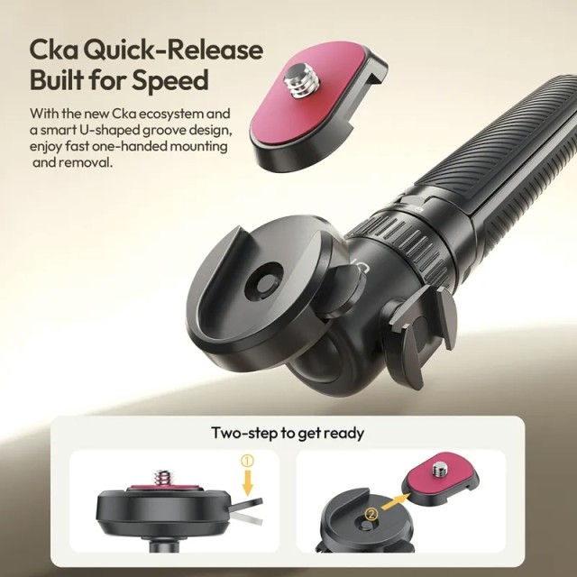 Zachyťte stabilné, profesionálne zábery bez námahy s rýchloupínacím statívom Ulanzi MT90 Cka. Toto univerzálne zariadenie 2 v 1 funguje ako selfie tyč aj ako stolný statív. Jeho 5-dielna výsuvná tyč dosahuje dĺžku až 62 cm, čo je ideálne pre selfie, skupinové zábery alebo fotografovanie z nízkeho uhla. Integrovaný systém rýchleho uvoľnenia Cka s drážkou v tvare U umožňuje rýchle pripevnenie a odstránenie fotoaparátov a zariadení jednou rukou. Hliníková guľová hlava s otočnosťou 360° vám umožňuje ľahko fotografovať z akéhokoľvek uhla, zatiaľ čo otočný držiak na mikrofón a malé svetlá slúži na vylepšenie tvorby obsahu. Statív unesie až 1,5 kg a je vybavený silikónovými rukoväťami a protišmykovými gumovými nožičkami pre väčšiu stabilitu. Súčasťou balenia sú rýchloupínacie dosky 1/4" a GoPro, ktoré ponúkajú širokú kompatibilitu s akčnými kamerami a inými zariadeniami.