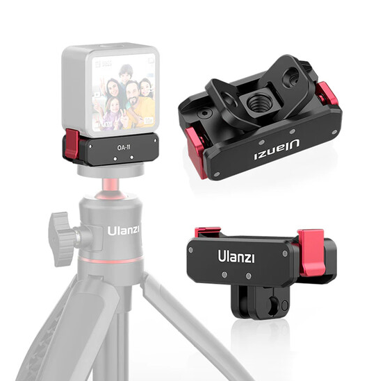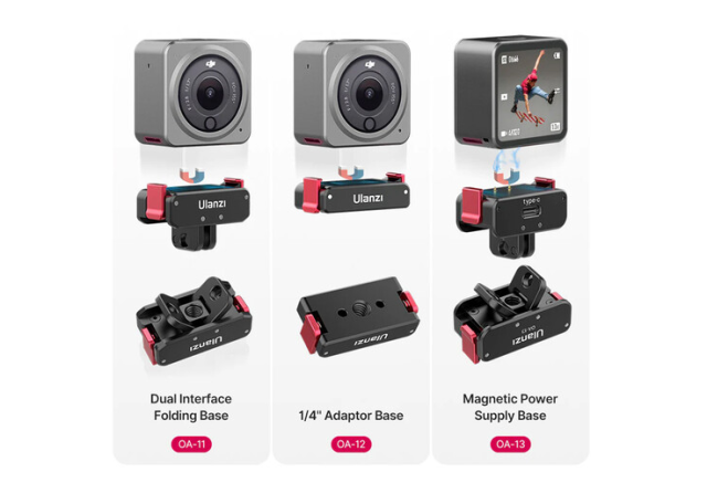 Sklopná základňa Ulanzi 2843A s dvojitým rozhraním, navrhnutá špeciálne pre DJI Action 2, rozširuje možnosti upevnenia kamery vďaka kompaktnému sklopnému dizajnu. Adaptér sa bezpečne pripája k fotoaparátu pomocou magnetickej základne a dvoch spôn a ponúka dve montážne rozhrania: 2-kolíkový držiak kompatibilný s držiakmi typu GoPro a skladateľnú základňu so závitom 1/4"-20, ktorá je ideálna pre statívy, kĺbové ramená alebo iné podpery.