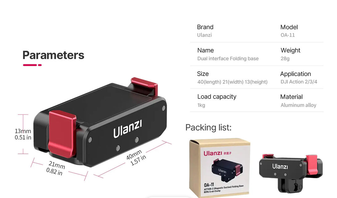 Skladací podstavec je vyrobený z ľahkej a robustnej zliatiny hliníka a unesie zaťaženie až 1 kg, čím zaručuje odolnosť bez zbytočného zvyšovania hmotnosti. Vďaka svojim tenkým rozmerom a hmotnosti 28 gramov je vysoko prenosný pre akčné videá, cestovanie alebo fotografovanie v exteriéri.