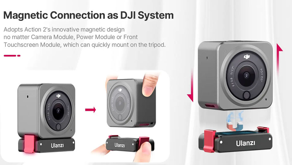 Magnetická základňa Ulanzi 2846A 1/4"-20 umožňuje rýchle a bezpečné magnetické upevnenie kamier DJI Action 2, 3 a 4, čím umožňuje jednoduché pripevnenie na statívy, magické ramená a iné podpery.