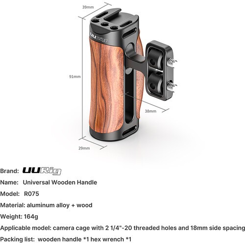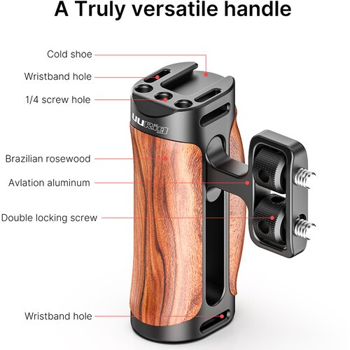 Univerzálna drevená rukoväť Ulanzi R075 Left/Right je navrhnutá tak, aby zlepšila ovládanie fotoaparátu, stabilitu a estetiku pre filmárov a tvorcov obsahu. Rukoväť je vyrobená z brazílskeho palisandru a zliatiny hliníka a ponúka prirodzene teplý, ergonomický úchop pri zachovaní odolnosti pre profesionálne použitie.