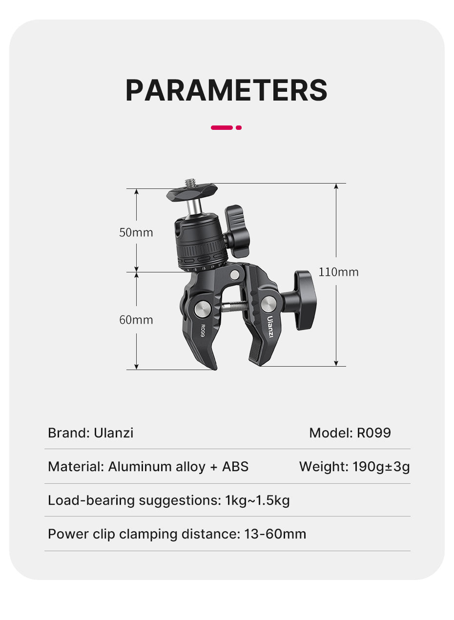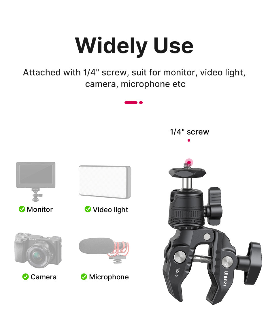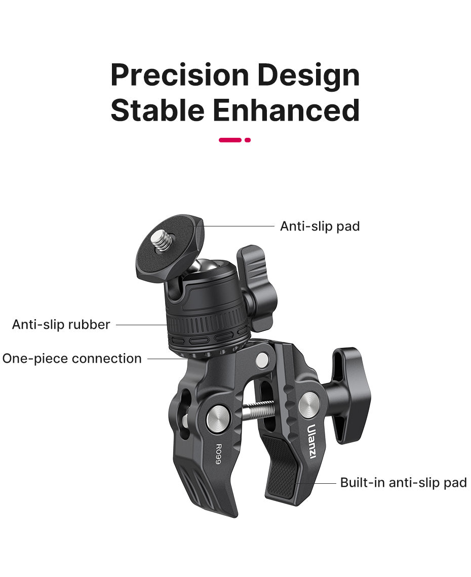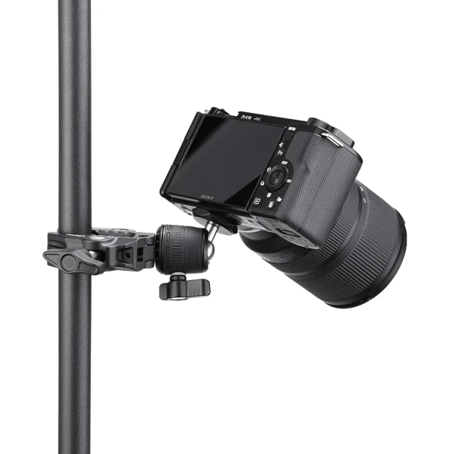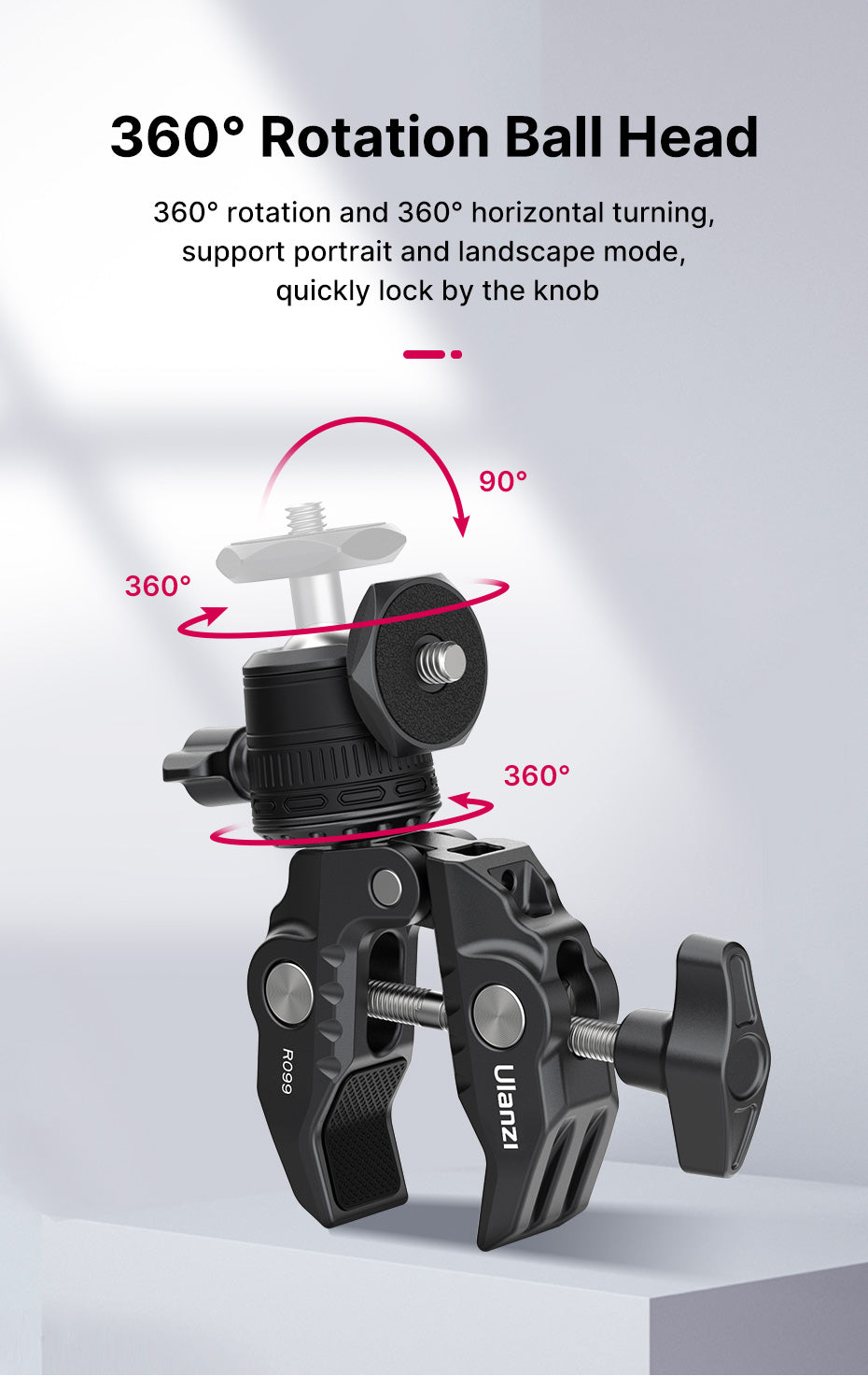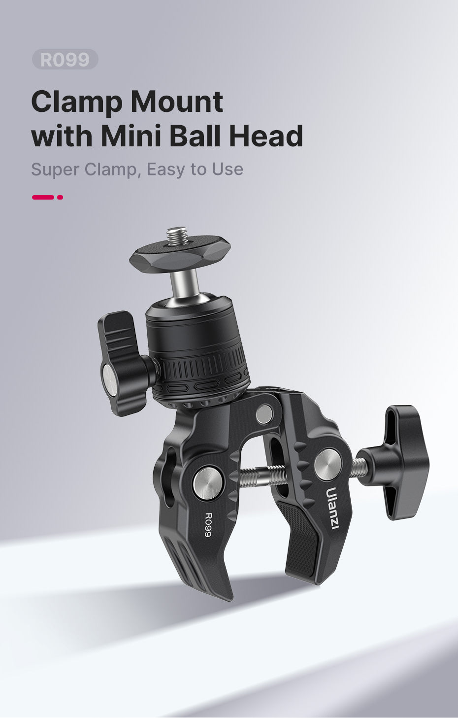 Ulanzi R099 Clamp Mount s mini guľovou hlavou je univerzálne, ultrakompaktné riešenie pre tvorcov, ktorí potrebujú stabilitu kdekoľvek. S otočnou guľovou hlavou o 360° a 1/4" skrutkou ľahko podporuje kamery, monitory, svetlá a mikrofóny. Presne navrhnutá svorka sa bezpečne pripája k stolom, tyčiam, vetvám a lištám, zatiaľ čo protišmykové gumové podložky zaisťujú stabilné uchytenie. S hmotnosťou len 190 g a rozmermi 11 cm je ideálny pre mobilné zostavy, cestovné zariadenia a stiesnené priestory na fotografovanie.