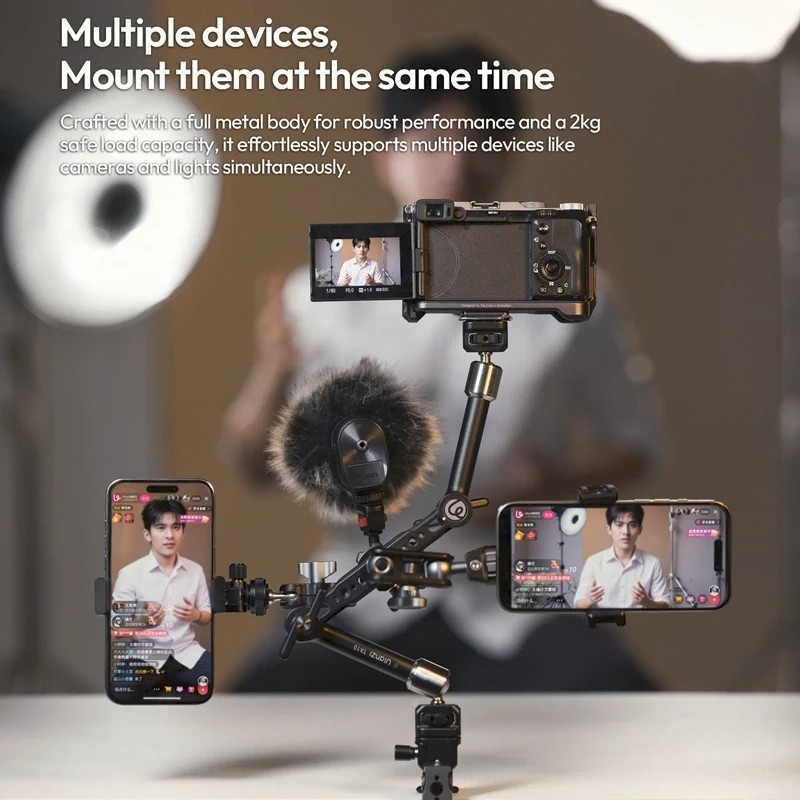 Rameno TA10 je vyrobené z hliníkovej zliatiny, nehrdzavejúcej ocele a silikónu a ponúka bezpečnú nosnosť 2 kg v horizontálnej polohe a až 4,5 kg vo vertikálnej polohe, čo mu umožňuje podporovať kamery, LED svetlá, monitory alebo viacero príslušenstiev naraz. Integrovaná 360° otočná guľová hlava s 90° orientáciou uľahčuje presné nastavenie uhlov.