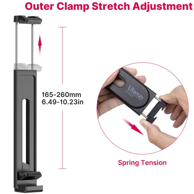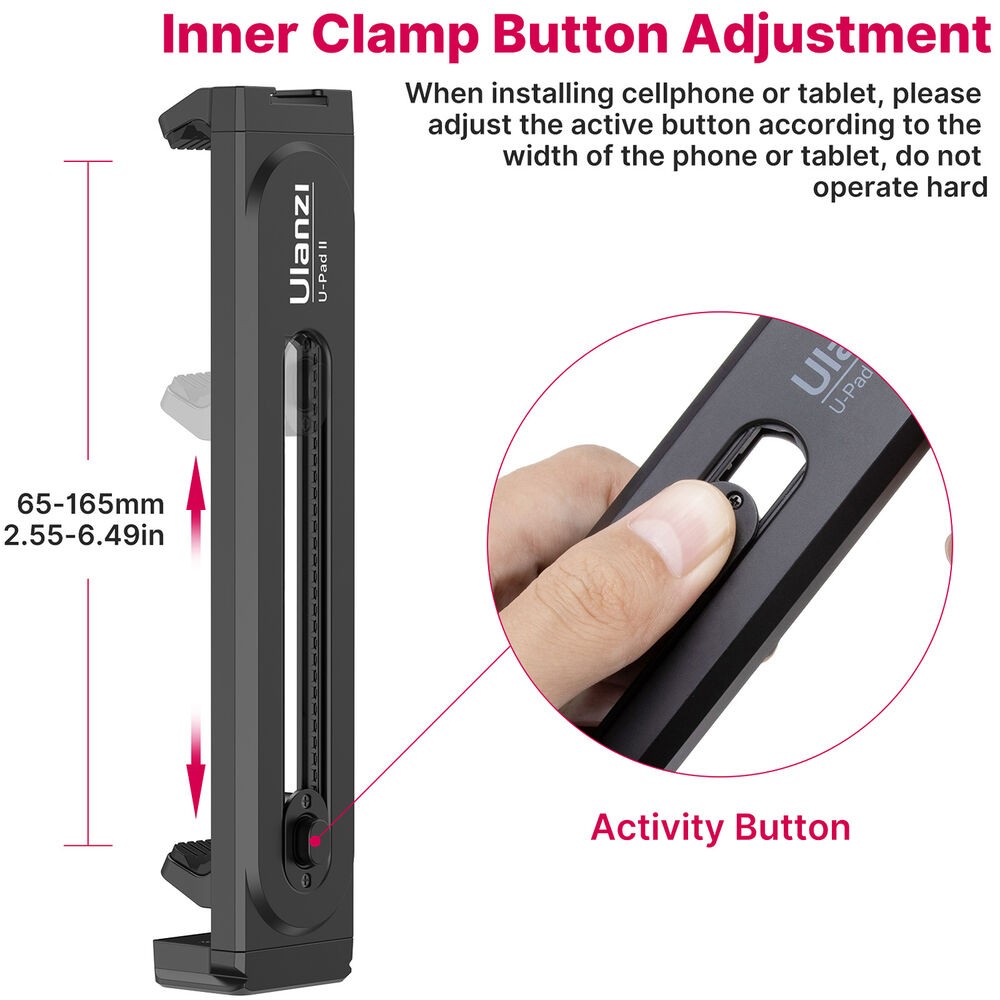 Ulanzi U-Pad II je univerzálna svorková podložka, ktorá bezpečne drží smartfóny alebo tablety s šírkou od 2,6 do 10,2 palca. Je vybavená tlačidlovými a pružinovými svorkami, 1/4" a Arca-štýlovými úchytmi a hornou studnou päticou pre príslušenstvo.