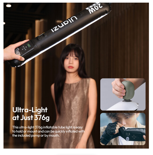 Rozžiarte svoju kreatívnu víziu s magnetickým vzduchovým tubusovým osvetlením Ulanzi UA20C RGB. Tento 2-stopový nafukovací LED tubus kombinuje prenosnosť, flexibilitu a magnetické upevnenie pre bezkonkurenčné pohodlie osvetlenia. Váži len 13,2 oz a nafúkne sa za pár sekúnd pomocou priloženej vzduchovej pumpy alebo dokonca ústami, čo umožňuje rýchle nastavenie na mieste.