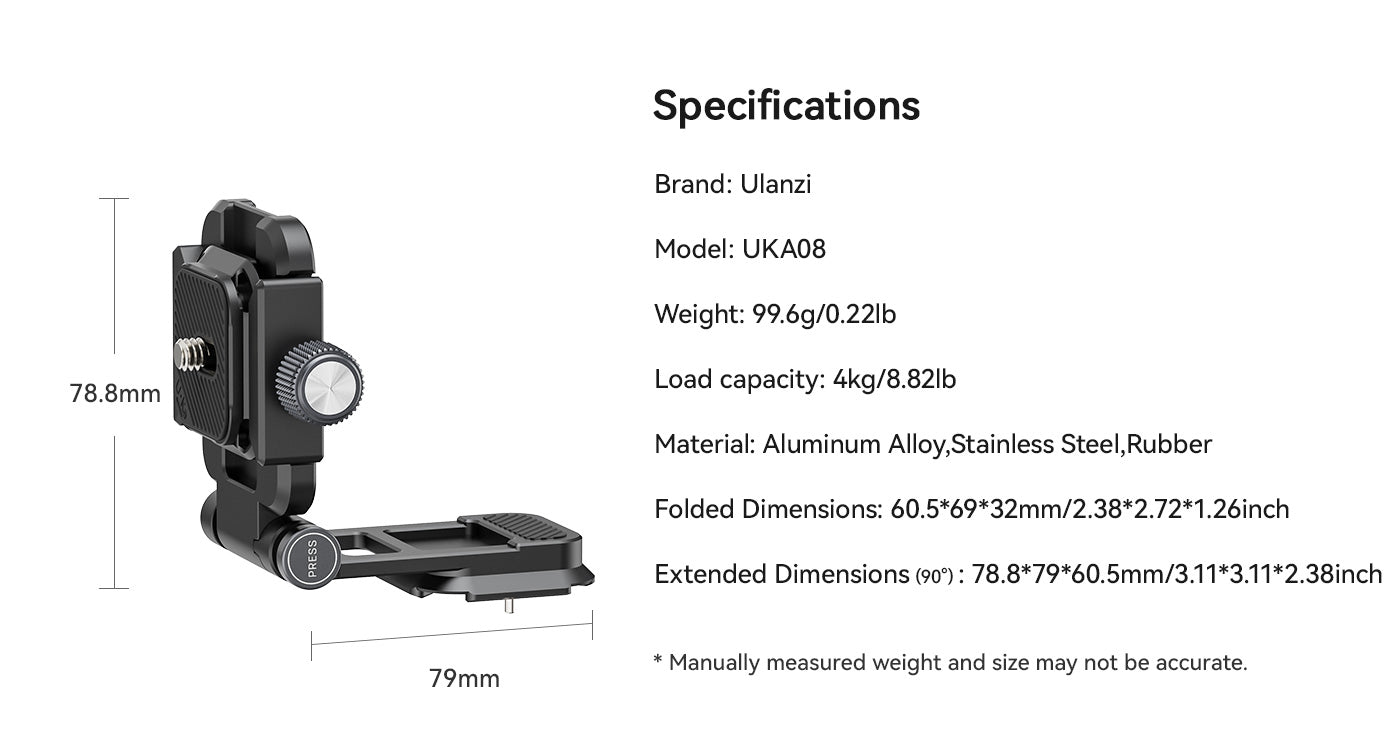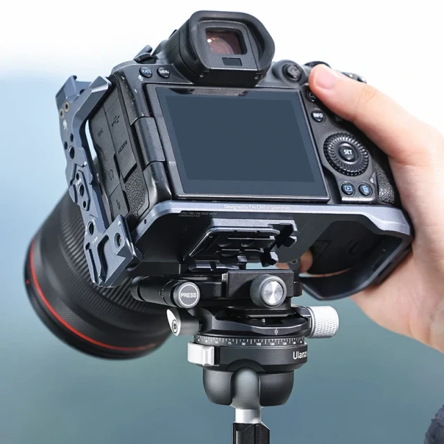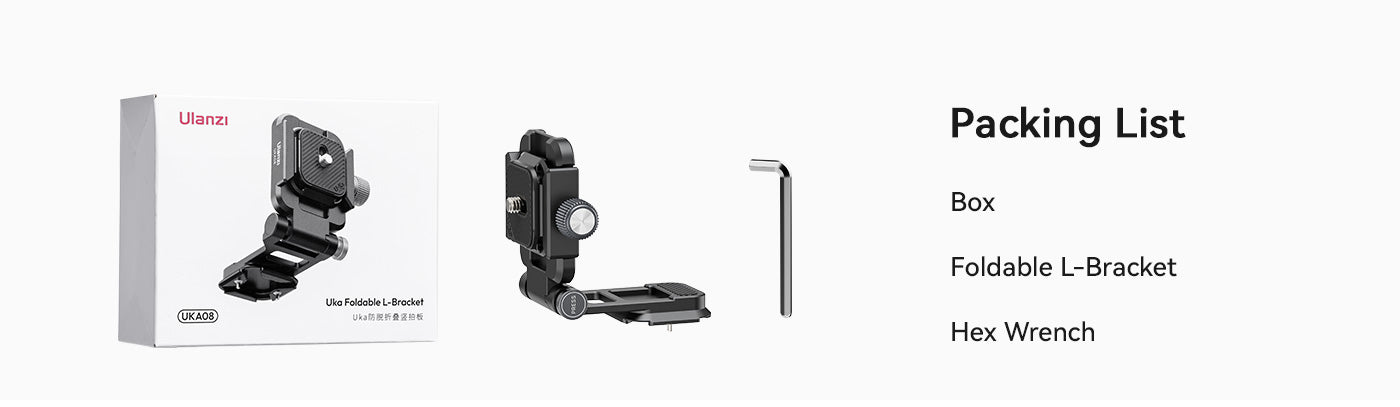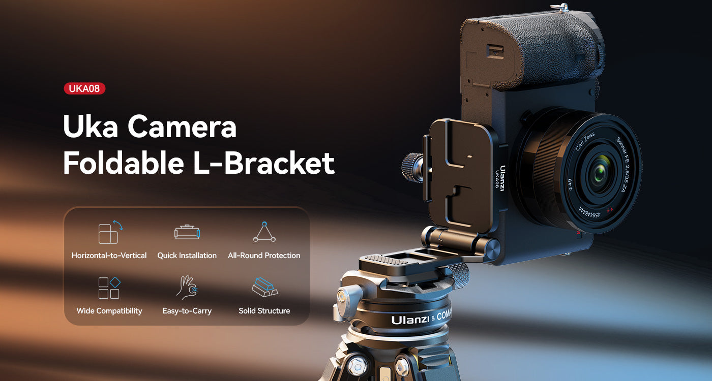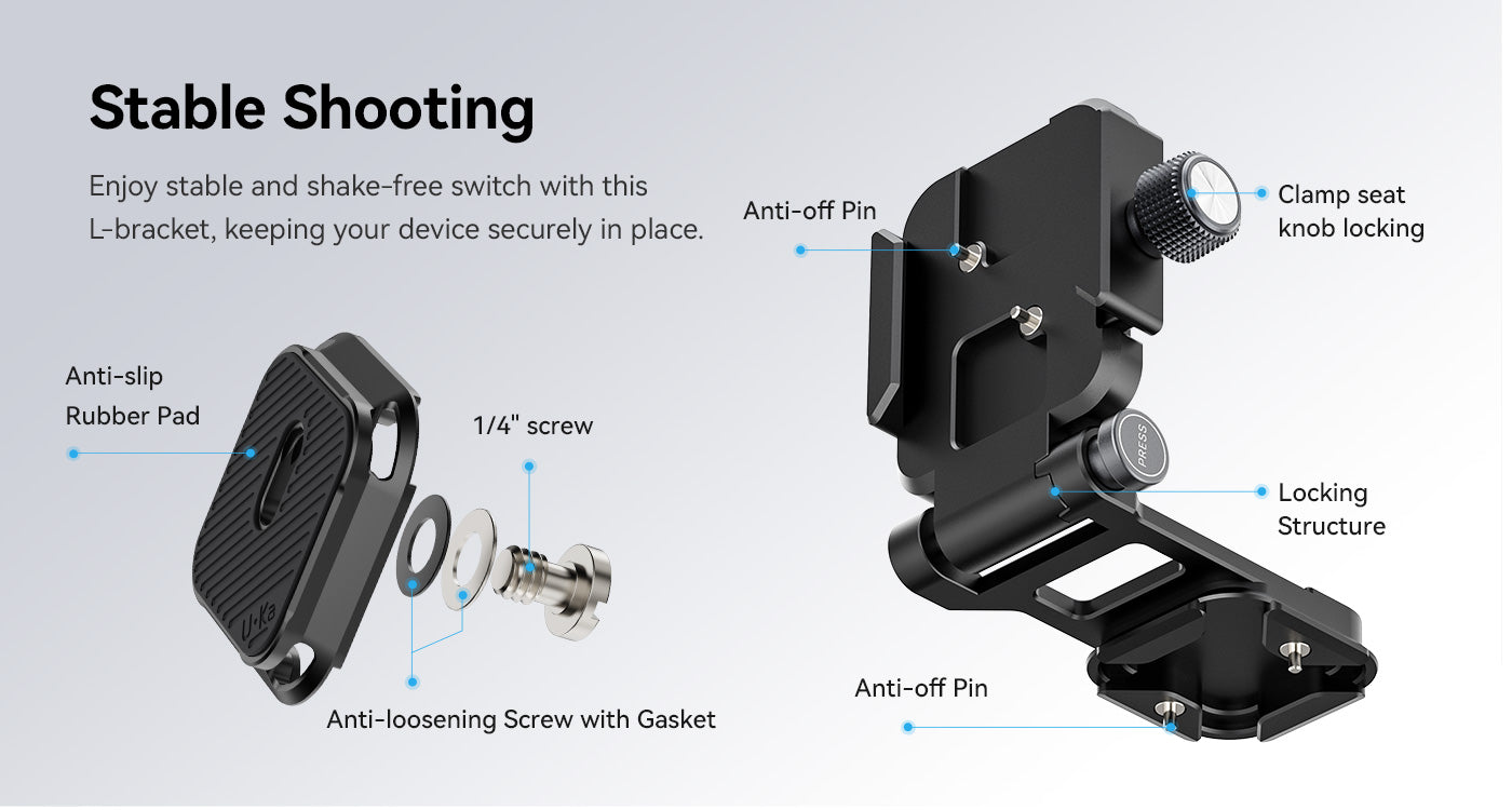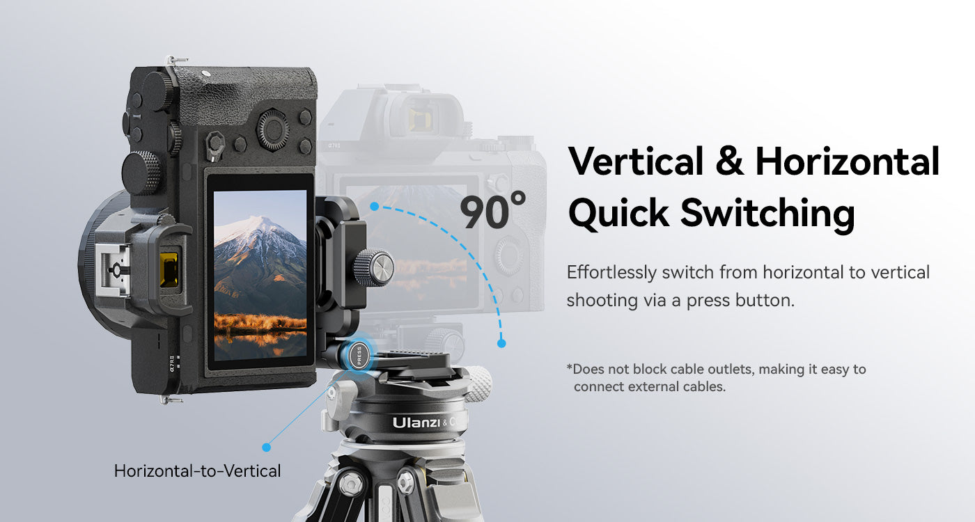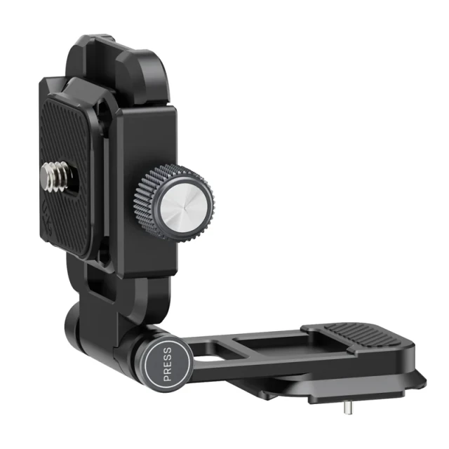 Skladací L-držiak. Rýchle prepínanie medzi vertikálnou a horizontálnou polohou Jednoduché prepínanie medzi horizontálnym a vertikálnym fotografovaním stlačením tlačidla. Kompatibilný s väčšinou rýchloupínacích dosiek. Jednoduché zamykanie a odomykanie otočným gombíkom.