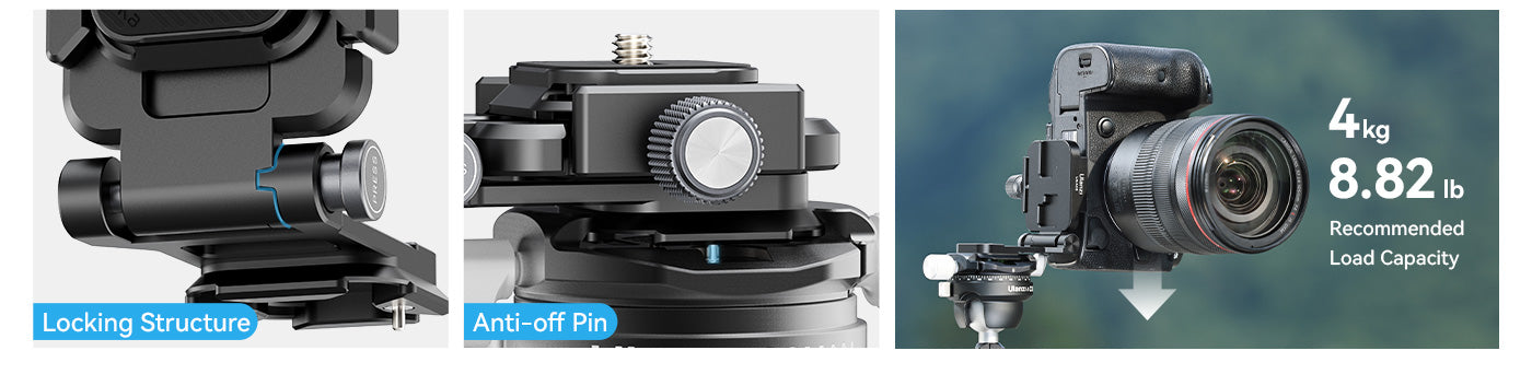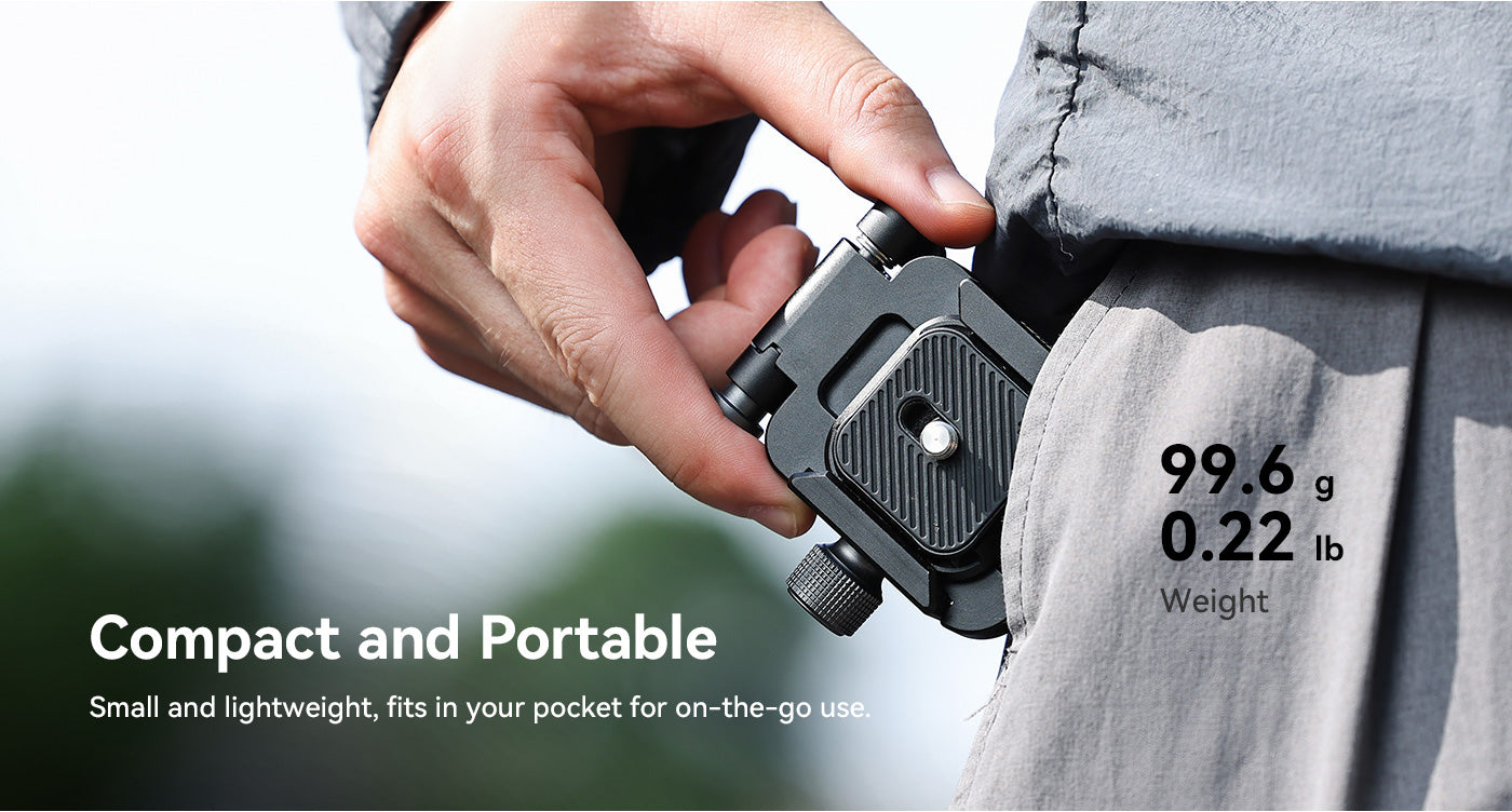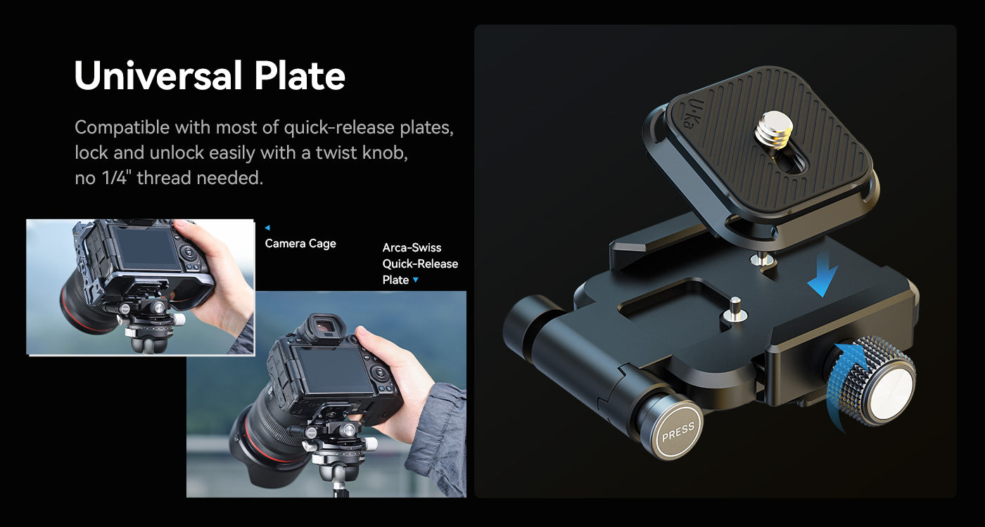 Univerzálna doska Kompatibilná s väčšinou rýchloupínacích dosiek. Jednoduché zamykanie a odomykanie pomocou otočného gombíka. Nie je potrebný 1/4" závit.