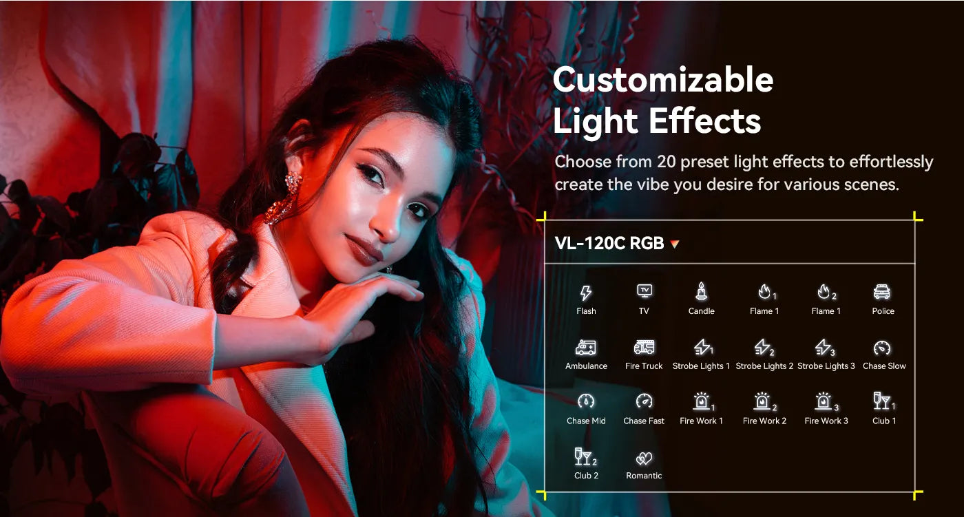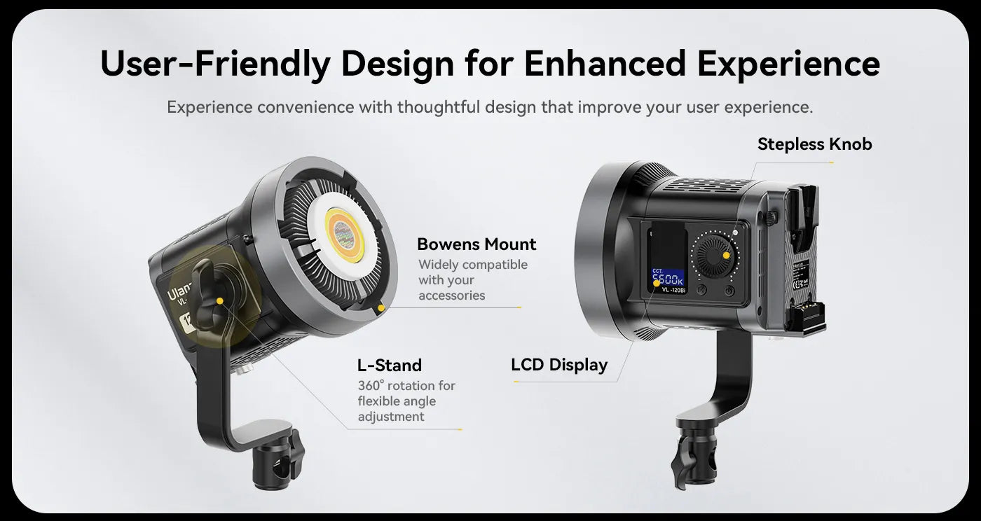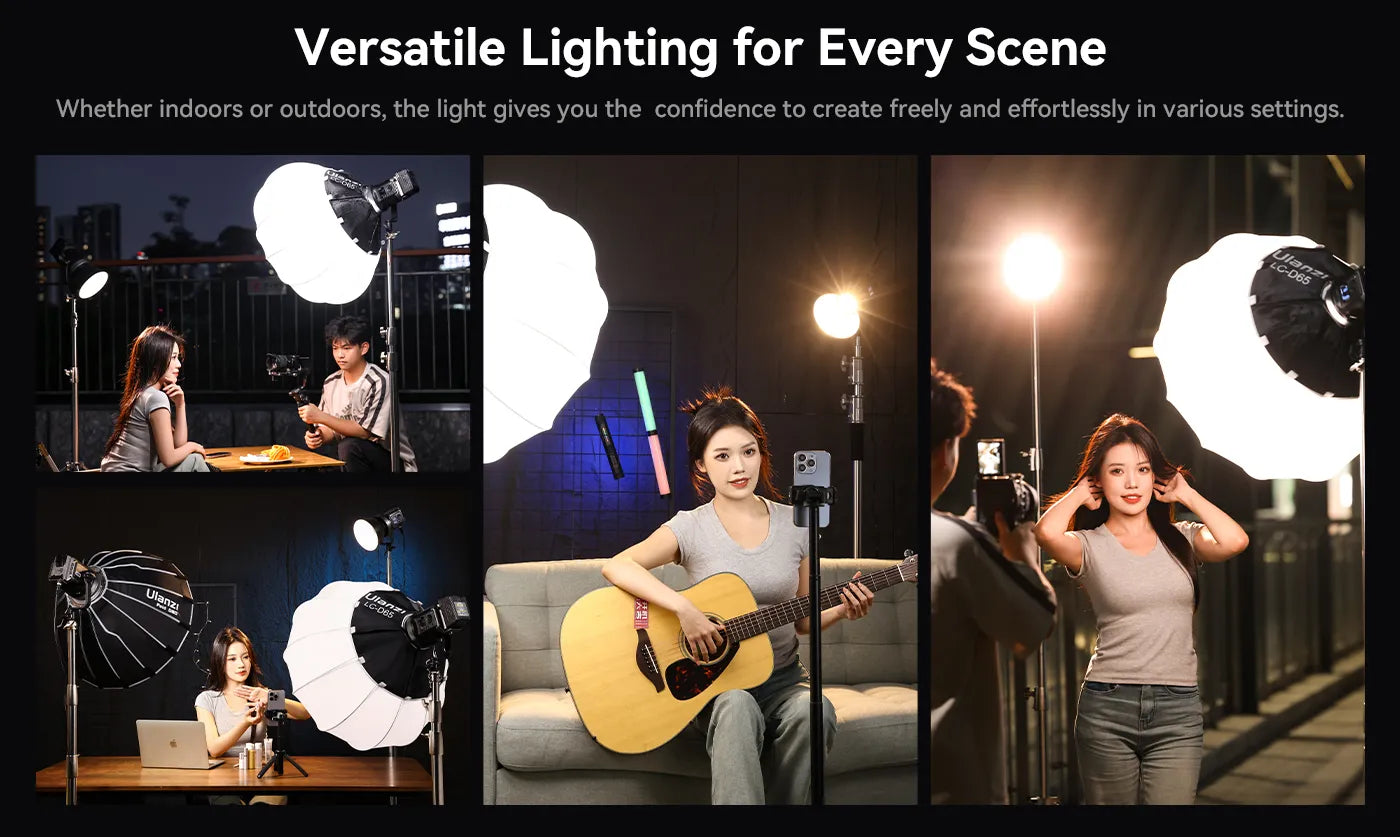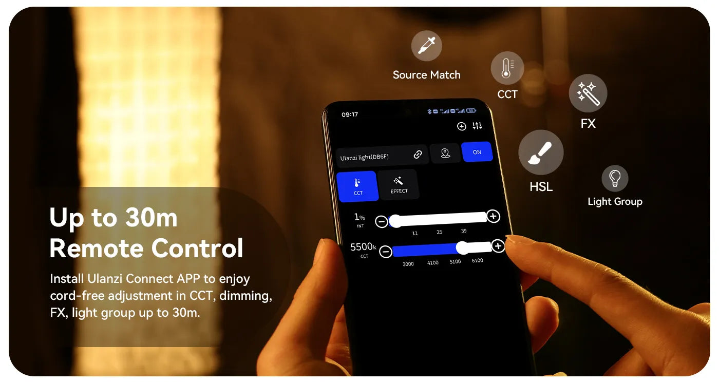 Ovládajte osvetlenie až na vzdialenosť 30 m pomocou aplikácie Ulanzi Connect, kde môžete prispôsobiť nastavenia ako CCT, stmievanie, FX a skupiny svetiel. Vychutnajte si 20 prednastavených svetelných efektov s verziou RGB alebo 6 s verziou Bi-color. Medzi užívateľsky prívetivé funkcie patrí LCD displej, plynulé otočné koliesko, otočný L-stojan o 360° a kompatibilita s uchytením Bowens.