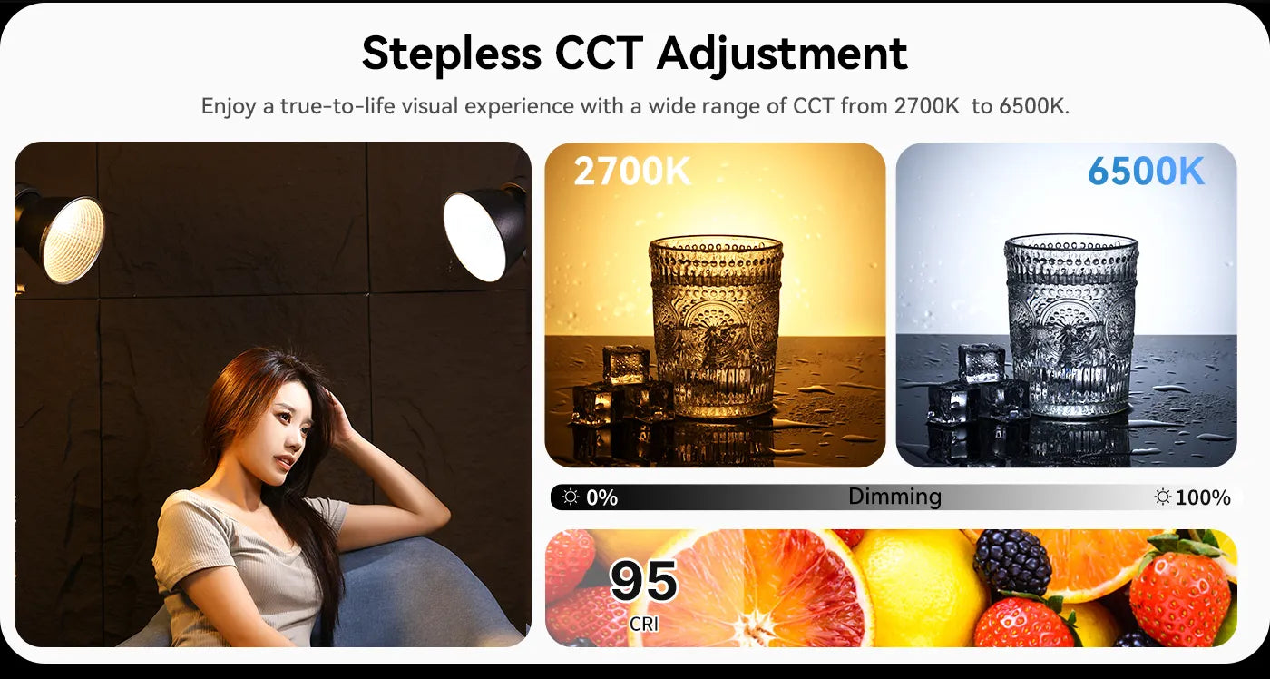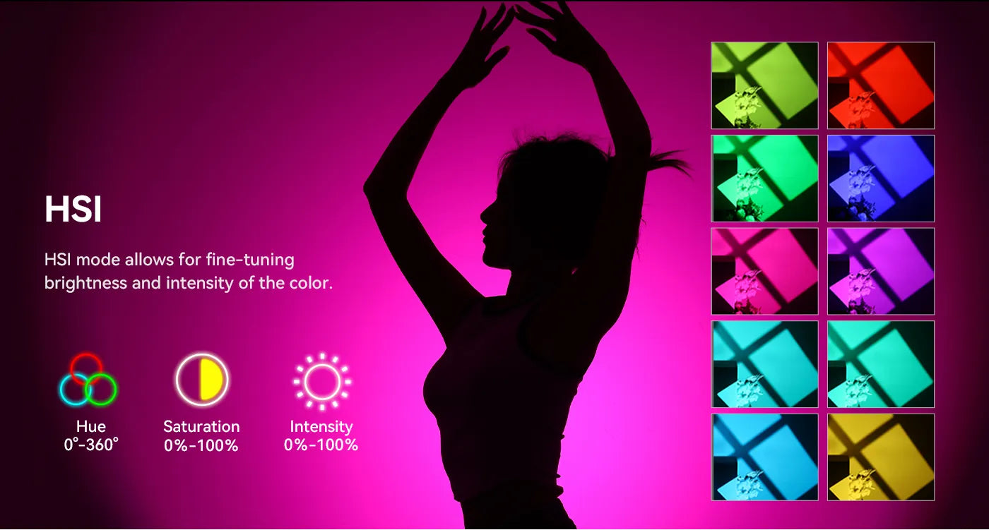 Vďaka dvojitým možnostiam napájania môžete vonku použiť batériu V-mount pre mobilitu alebo v interiéri napájací adaptér DC pre stabilné napájanie. Nastavte farebnú teplotu plynule od 2700 K do 6500 K (CRI > 95) a stmievanie od 0 % do 100 %. V režime HSI môžete jemne doladiť odtieň, sýtosť a intenzitu v celom farebnom spektre 360°.