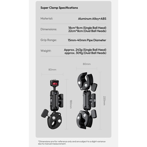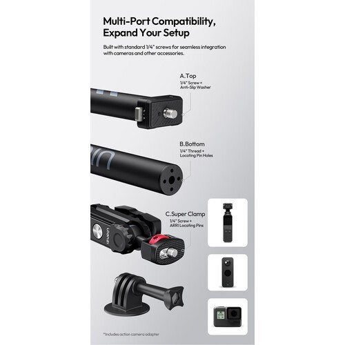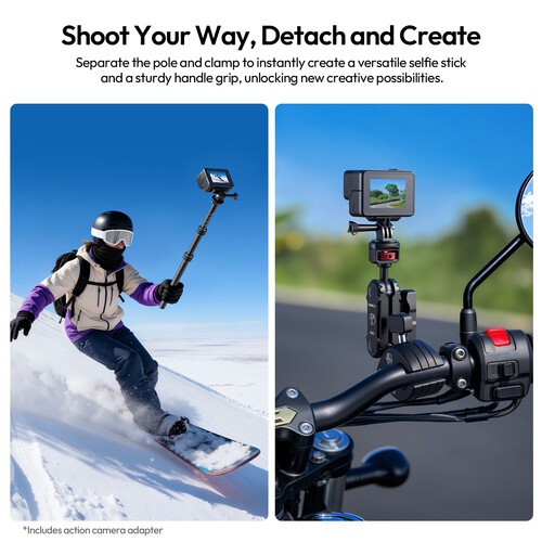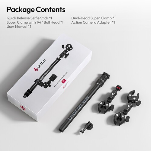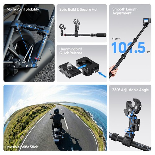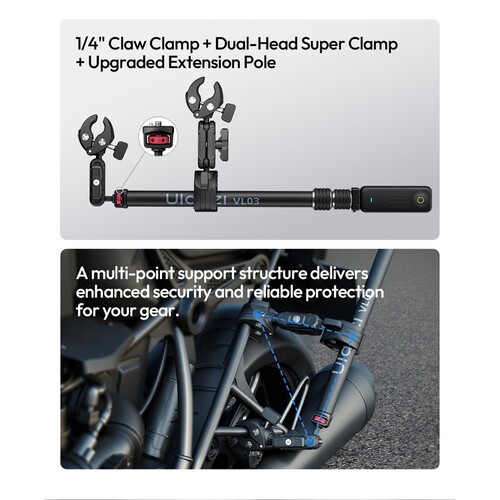 Držiak na selfie tyč Ulanzi VL03 pre motocykle je odolný a stabilný upevňovací systém určený na zaznamenávanie plynulých, filmových záberov počas jazdy vysokou rýchlosťou. Vďaka vylepšenému systému s dvoma svorkami – 1/4" svorkou s pazúrikom a super svorkou s guľovou hlavou – zaručuje absolútnu stabilitu pri jazde na motocykli, pri akčných športoch a outdoorových dobrodružstvách. Je kompatibilný s akčnými kamerami a selfie tyčami a poskytuje odolnosť voči vibráciám pre zábery z pohľadu prvej osoby v profesionálnej kvalite.