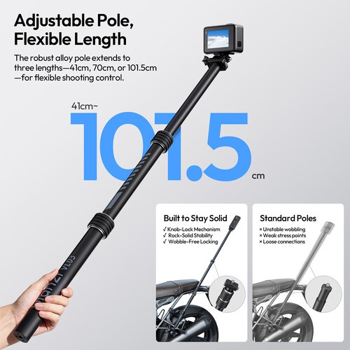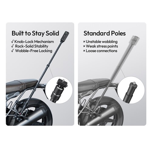 Držiak na selfie tyč Ulanzi VL03 pre motocykle je profesionálne upevňovacie riešenie navrhnuté pre motocyklistov a tvorcov akčných videí, ktorí pri snímaní dynamických záberov potrebujú maximálnu stabilitu a univerzálnosť. Tento vylepšený systém, navrhnutý špeciálne pre motocykle a prostredia s vysokou rýchlosťou pohybu, zaručuje plynulé a bezchvejivé nahrávanie aj pri vysokých rýchlostiach.