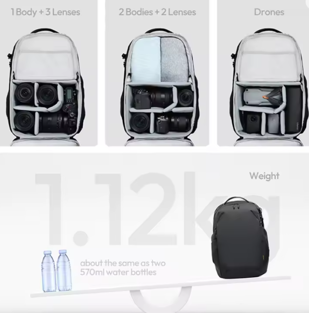 Vo vnútri batohu sa nachádzajú prispôsobiteľné deliace panely na suchý zips, ktoré používateľom umožňujú prispôsobiť úložný priestor rôznym konfiguráciám, či už prenášajú bezzrkadlovú súpravu, kompletnú výbavu DSLR alebo vybavenie pre dron. Pohodlne podporuje konfigurácie, ako je jedno telo fotoaparátu s tromi objektívmi, dve telá fotoaparátov s dvoma objektívmi alebo dron s ovládačom a príslušenstvom, čím zabezpečuje maximálnu flexibilitu pre rôzne kreatívne pracovné postupy.