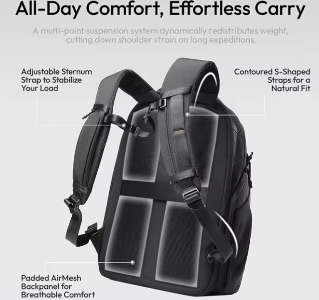 Batoh je navrhnutý pre celodenné pohodlie a je vybavený viacbodovým zavesením, ktoré pomáha rovnomerne rozložiť váhu na ramená a chrbát, čím znižuje únavu pri dlhodobom používaní. Obsahuje nastaviteľné hrudné popruhy pre väčšiu stabilitu, tvarované ramenné popruhy v tvare S pre prirodzené nosenie a polstrovaný zadný panel AirMesh, ktorý zlepšuje prúdenie vzduchu a priedušnosť počas cestovania alebo dlhých fotografických sedení.
