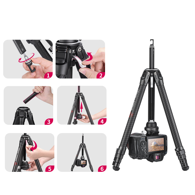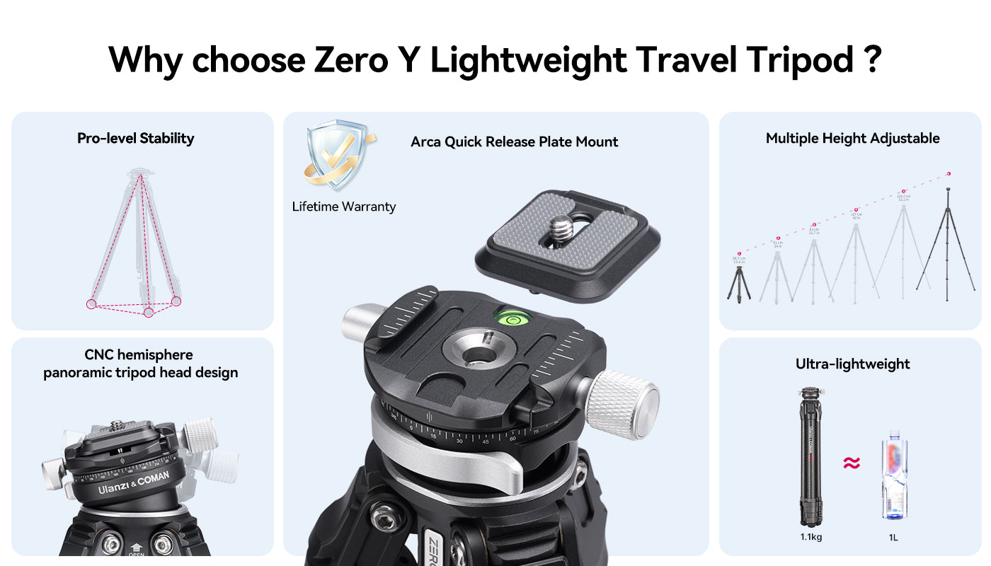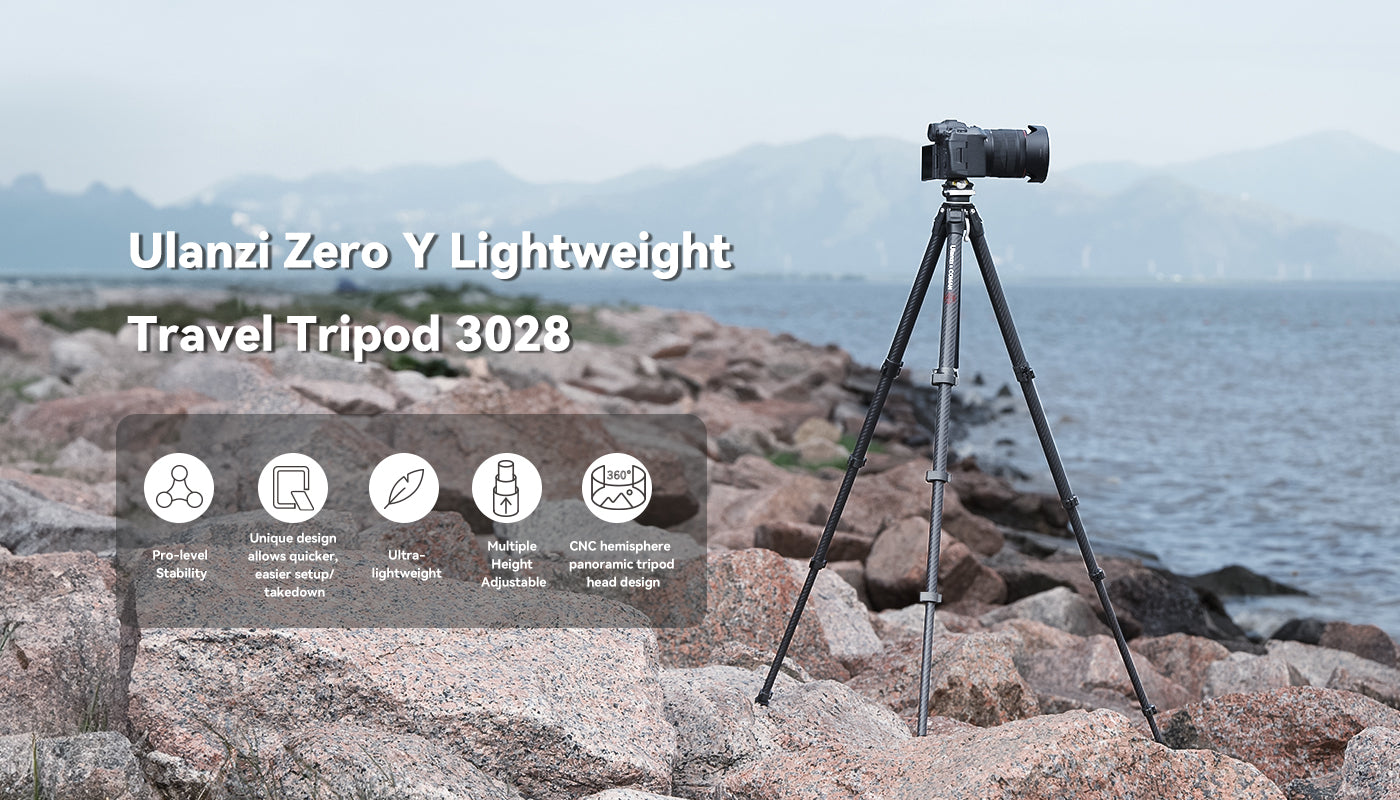 Ľahký cestovný statív Ulanzi Zero-Y z uhlíkových vlákien 3028. Stabilita na profesionálnej úrovni. Unikátny dizajn umožňuje rýchlejšie a jednoduchšie nastavenie/rozloženie. Ultraľahký. Nastaviteľná výška. Panoramatická hlava statívu s dizajnom CNC hemisféry.