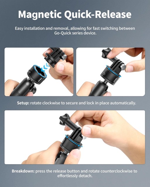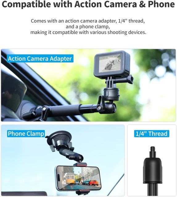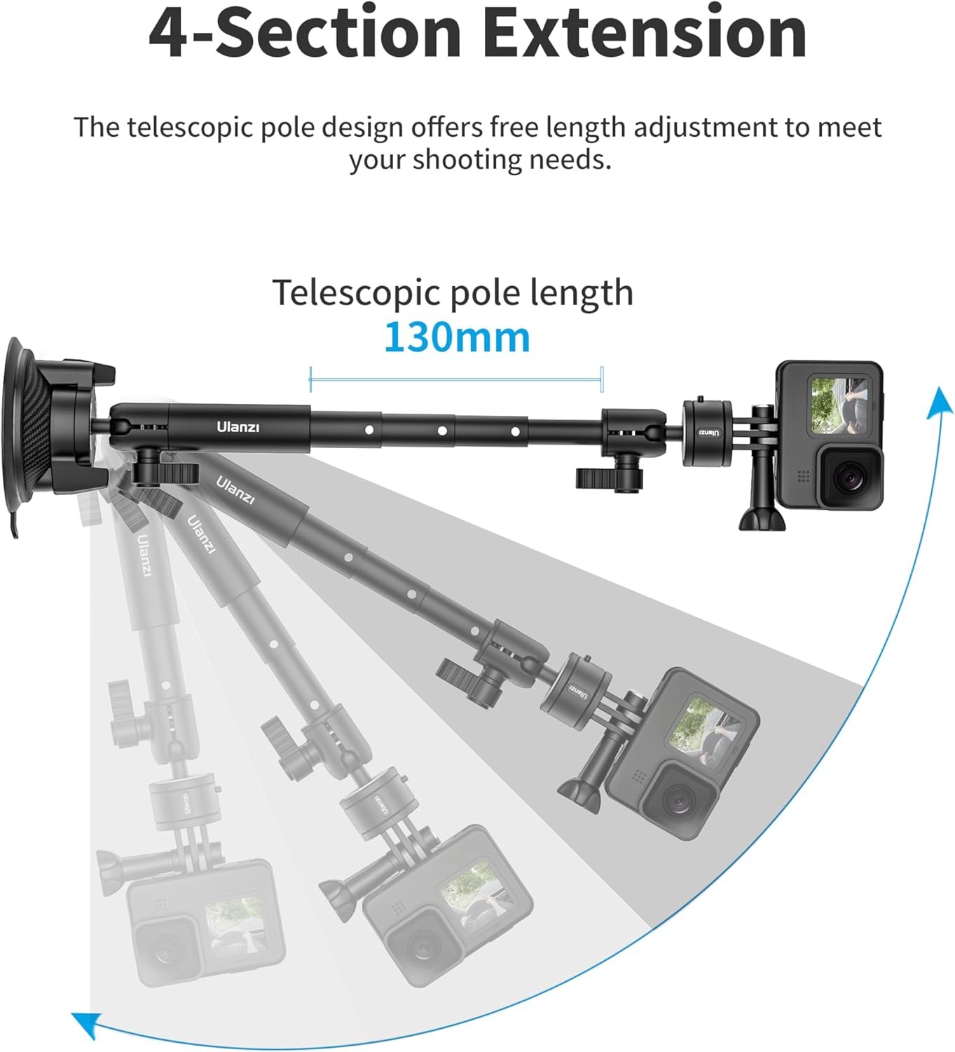 Teleskopické rameno držiaka obsahuje štyri výsuvné tyče, ktoré umožňujú nastavenie až do 5,12 palca, aby ste dosiahli perfektnú perspektívu bez ohľadu na umiestnenie povrchu. Ideálny pre POV video, montáž na vozidlo, nastavenie na stole alebo flexibilné fotografovanie v interiéri/exteriéri, ZJ01 kombinuje stabilitu, univerzálnosť a pohodlie pre tvorcov obsahu na cestách.