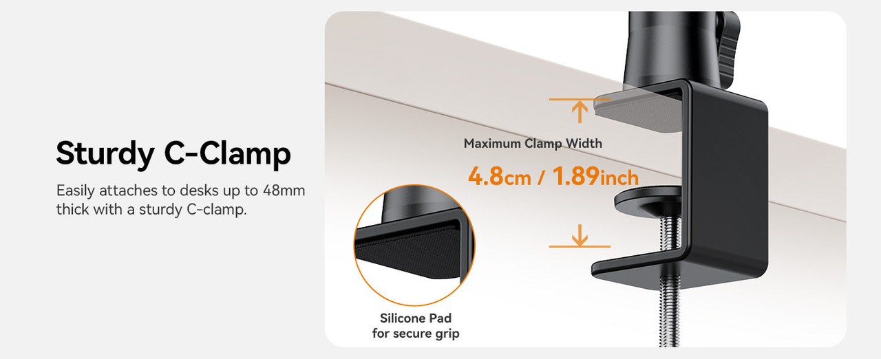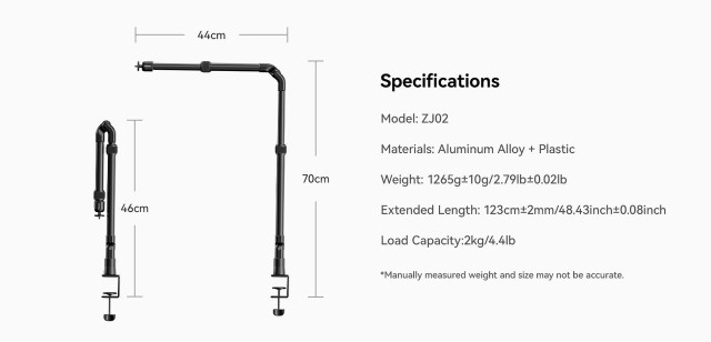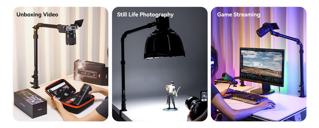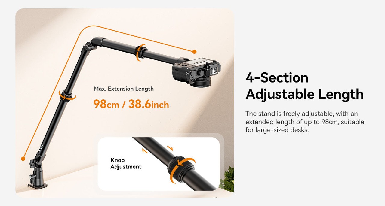 Sklopný držiak Ulanzi ZJ02 C-Clip je univerzálny hliníkový držiak na stôl s flexibilným ramenom, ktorý je ideálny na fotografovanie z rovnej plochy, streamovanie alebo zábery z nadhľadu. Je nastaviteľný do výšky 65 cm a dĺžky 123 cm a pomocou pevnej C-svorky bezpečne drží zariadenia s hmotnosťou do 2 kg.