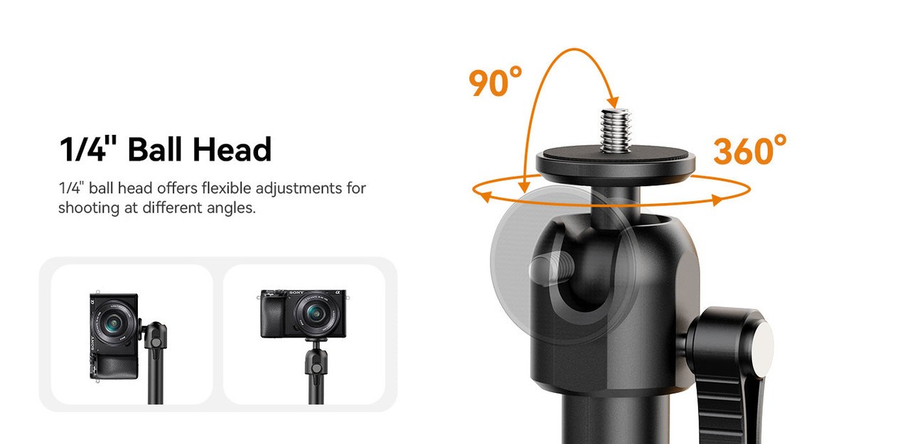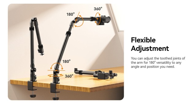 Zachyťte perfektný uhol s držiakom Ulanzi ZJ02 Camera Desk C-Clamp Mount Stand s držacím ramenom. Tento držiak je navrhnutý pre maximálnu flexibilitu a je vybavený ozubenými kĺbmi, ktoré umožňujú nastavenie v rozsahu 180°, čím vyhovuje širokej škále fotografických pozícií. Horné rameno sa dá vysunúť až do dĺžky 65 cm, čo je ideálne pre fotografovanie z rovnej plochy, zatiaľ čo celý stojan sa dá vysunúť až do dĺžky 123 cm, aby sa zmestil na väčšie stoly. Je vyrobený z odolnej zliatiny hliníka a plastu a bezpečne udrží zariadenia s hmotnosťou až 2 kg. Guľová hlava 1/4" umožňuje presné nastavenie uhla a robustná C-svorka so silikónovou podložkou zaisťuje bezpečný úchop na stoloch s hrúbkou až 48 mm. ZJ02 je ľahký, ale robustný a je ideálny pre tvorcov obsahu, fotografov a kameramanov, ktorí hľadajú stabilitu a univerzálnosť v jednom držiaku.